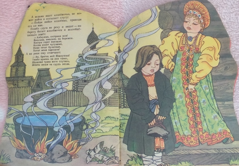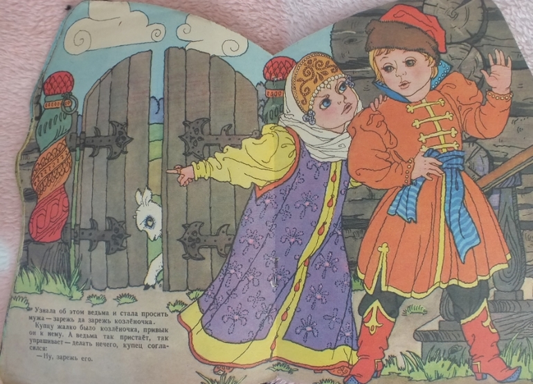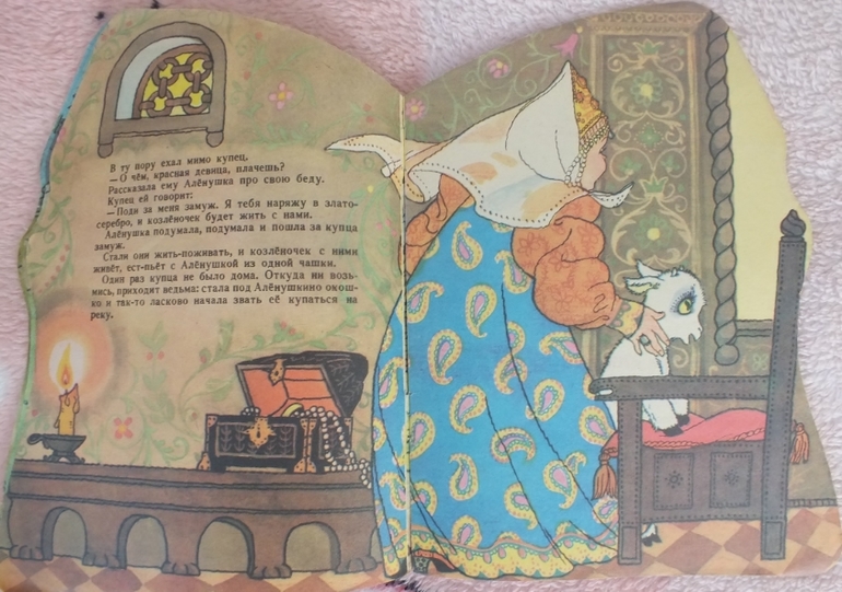Тоже пока не решила, что с ней делать. Иллюстрации, конечно, аховые, чего только стоит козленок, знающий толк в макияже. Зато Аленушка какая нарядная, и туалеты на каждой странице новые ,да и купец не отстает..и выбросить рука не поднимается, и читаю через силу. Ярослава на наряды внимания не обращала пока,а сказку слушала.