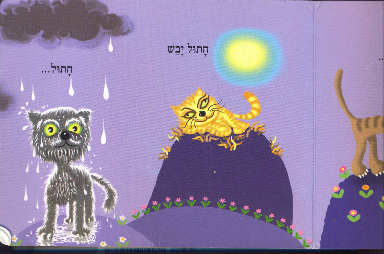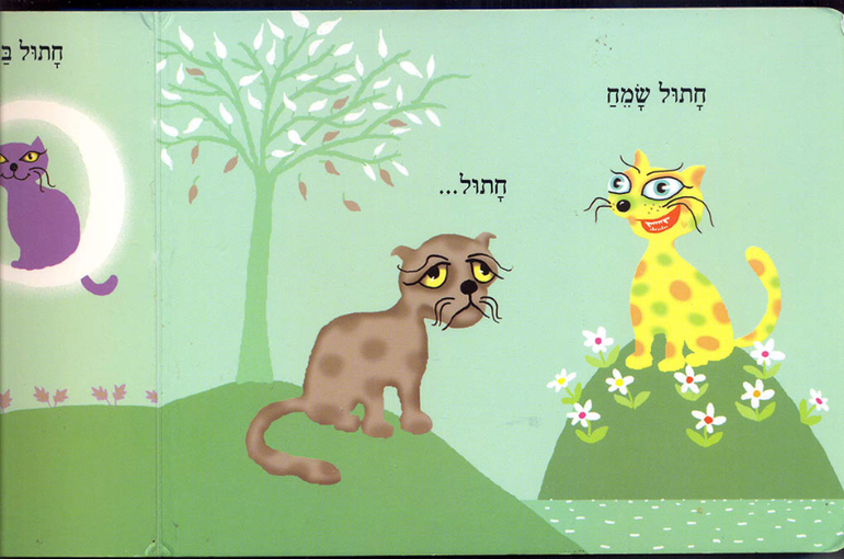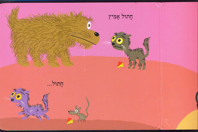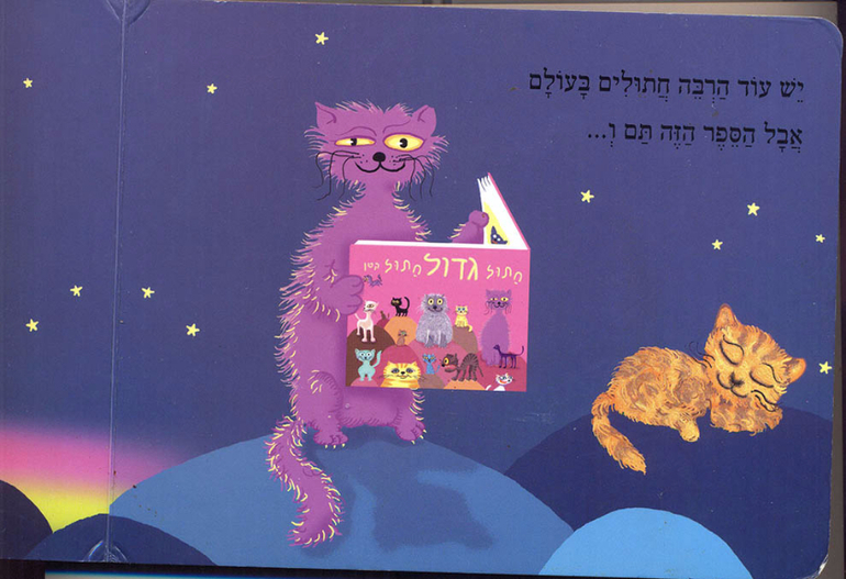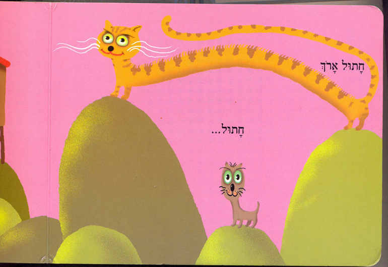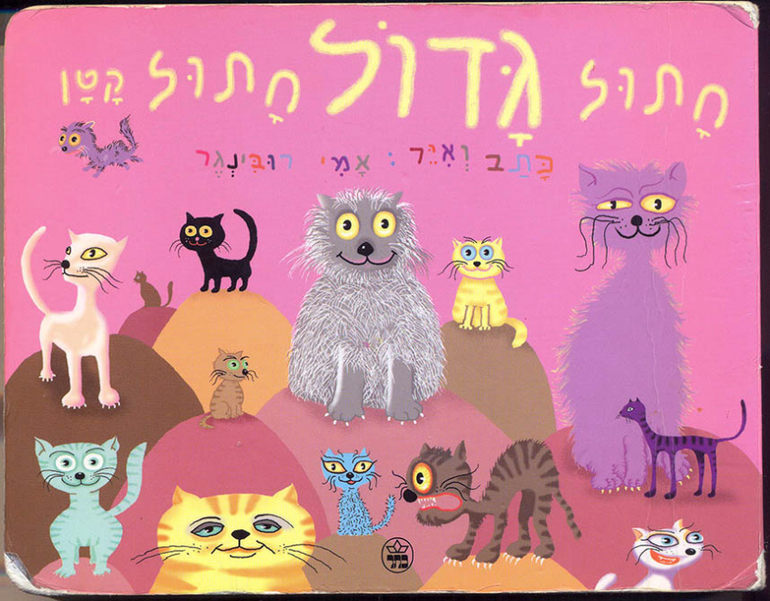 1. Ами Рубингер "Большой кот, маленький кот" - наш бессменный хит! Книжка-картонка для совсем маленьких с большим юмором показывающая антонимы. Вообще я в свое время, и дочка за мной, влюбились в этого автора. У нас есть практически все его книжки-картонки. Стиль его рисунков и слегка юмористичное содержание (одна "Нету таких львов" чего стоит ;)) , с легким подмигиванием взрослым , очень на любителя. Несколько из его книг вышли и на английском (), но часть переводов (хотя слов там раз-два и обчелся) потеряли ту улыбку в уголках рта, которая была видна на иврите.. Я думаю, что если бы ее перевели на русский она бы, может, сохранилась...