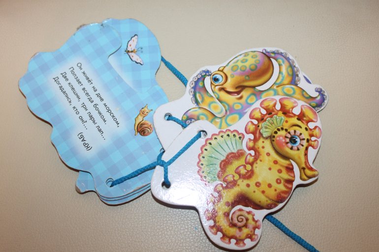 Также удобна для того,чтобы взять ее в дорогу, красиво нарисованы морские обитатели, а на обороте мы читаем загадки.