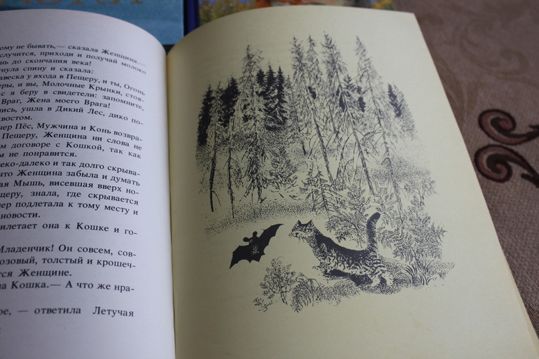 Из книги сказок Киплинга читаем "Кошку, которая гуляла сама по себе". Диме очень нравится, мультик тоже смотрел. Интересно, что он тоже подмечает фразы (сравнивает с мультиком, как с ПиФ). Иллюстраций Курдова не много, но это не критично. Ну а я просто получаю большое удовольствие от чтения.