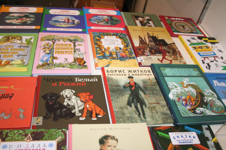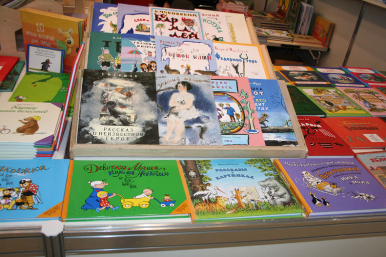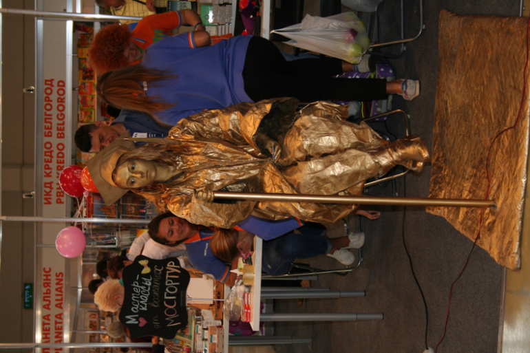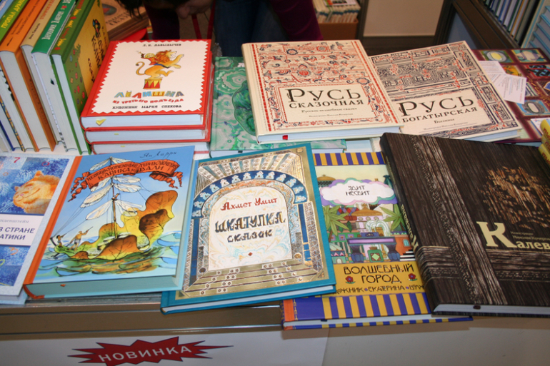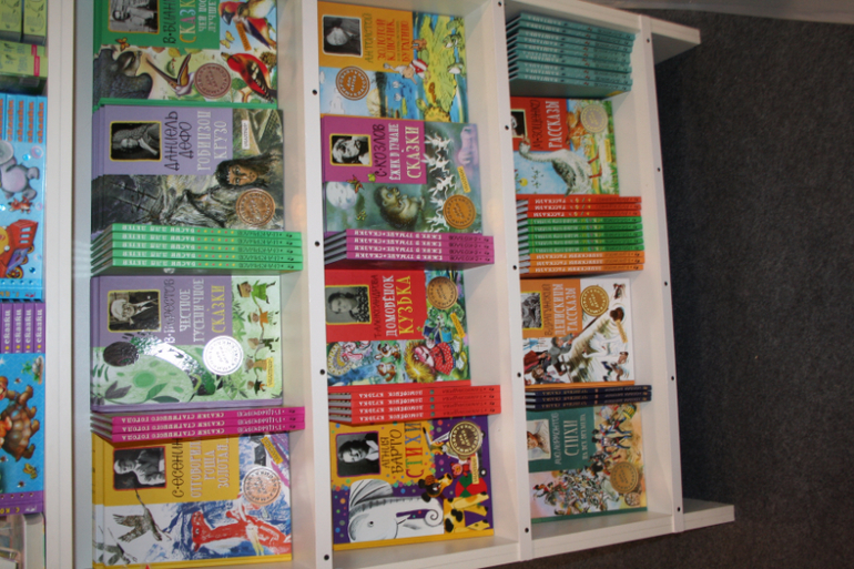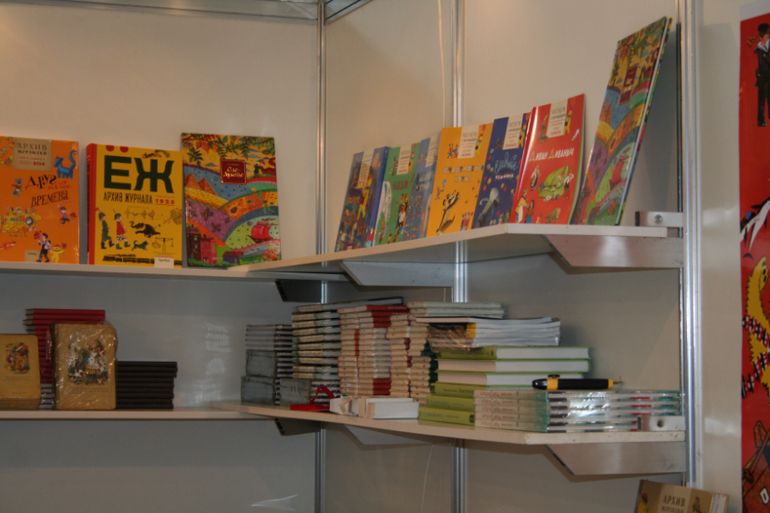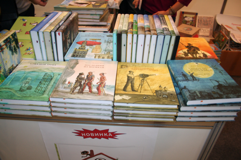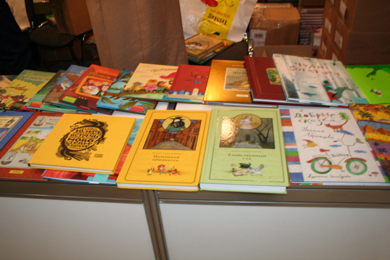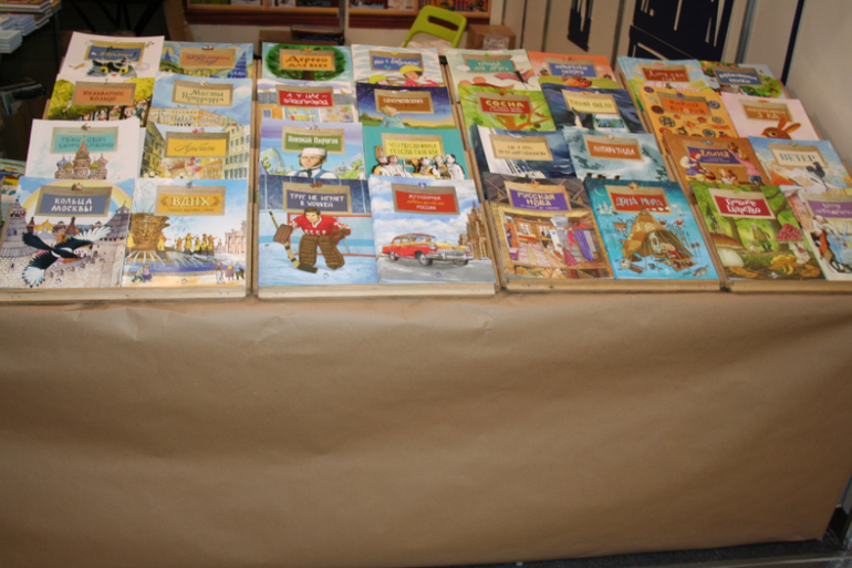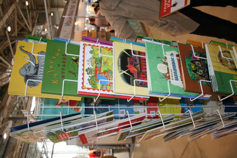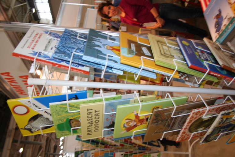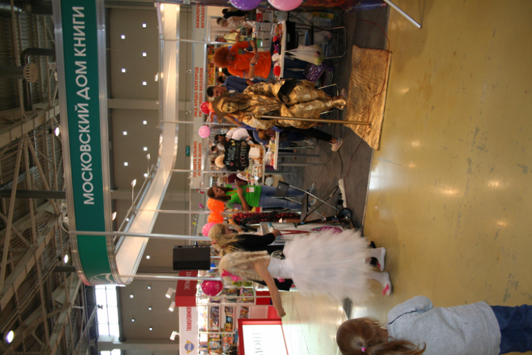 Далее я уже просто прошлась по стендам, заглянула к Мелику - Пашаеву, к Тримагу, красивые у них книги, но Мурзилка у меня уже есть, а к остальному присмотрюсь потом, так же нашла стенд Насти и Никиты, посмотрела на их новинки, сфоткала стенд Розового Жирафа, у них была коробка все книги по 100р, увидела бронзовую девушку у стенда Малыш, не знаю зачем она сидела там на стуле, прошлась по стендам других стран - Греции, Казахстана... Ничего интересного не нашла. Помню в том году выкладывали куча фоток с красивыми вазонами, коврами и прочими изысками стран Ближнего Востока, в этот раз ничего такого не было, да и детские уголки были скромными в сравнении с фотками с прошлой выставки. Наверное кризис все таки сказывается на всех. В общем самым интересным на этой выставке мне показался стенд Речи. Возможно было и еще что то, но я это не зацепила взглядом. Хотела дойти еще до стенда Детской литературы, люблю их бюджетную серию Школьная библиотека, но они где то запрятались и я их не нашла. Были они не в детском отсеке, а в другом месте. Вообщем походив минут 30 мы решили уже удаляться, так как главное сделано, книги куплены, можно и ехать, вернулись к стенду Речи, загрузили коляску 5 сумками общим весом кг 40 и поехали на выход. В итоге на выставке пробыли чуть меньше 2 часов, 40 минут из которых я провела в очереди за билетами. Но для меня этого было вполне достаточно, чтобы увидеть, то что мне было нужно и купить все по списку.