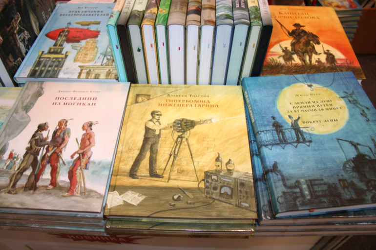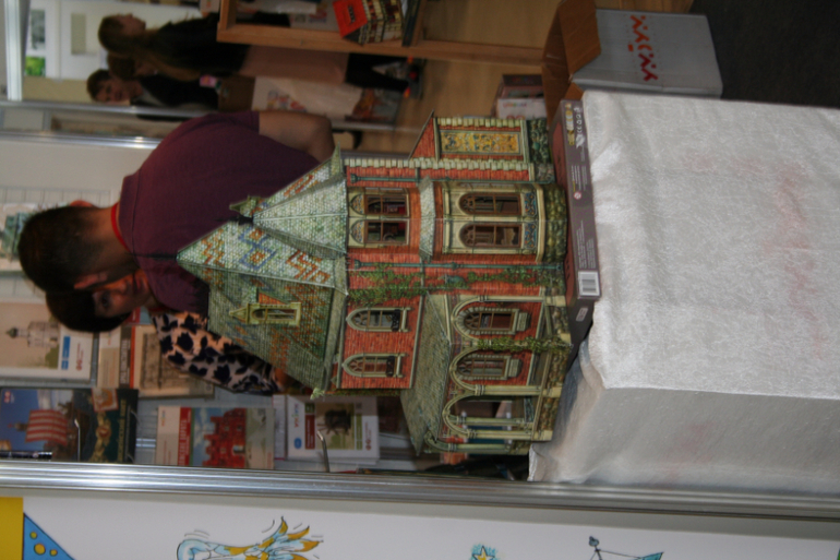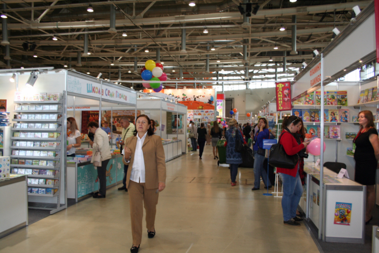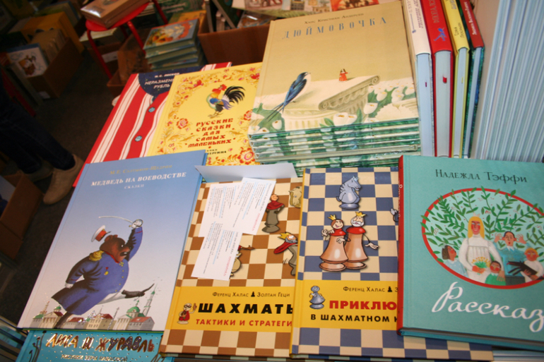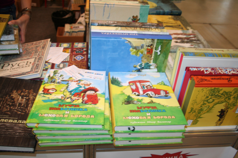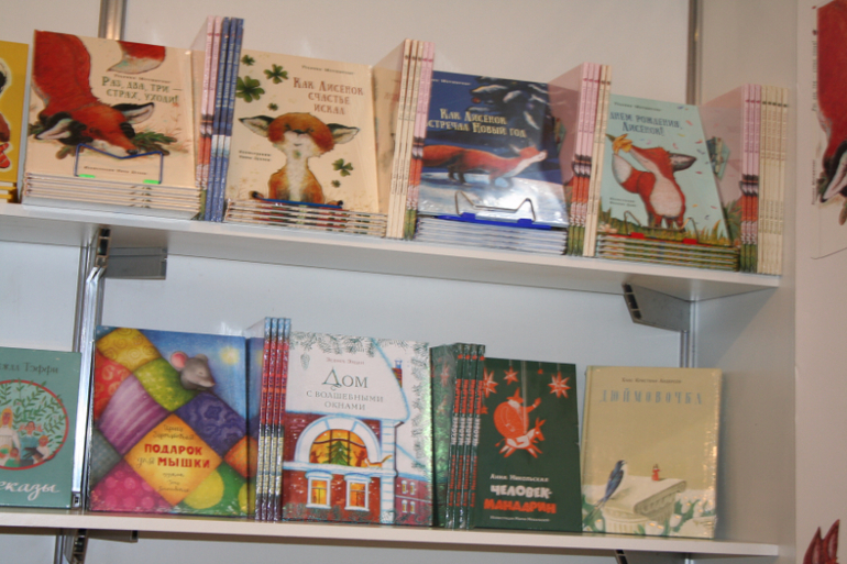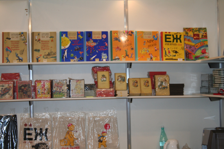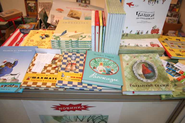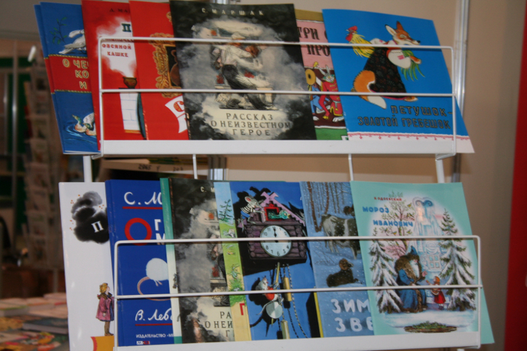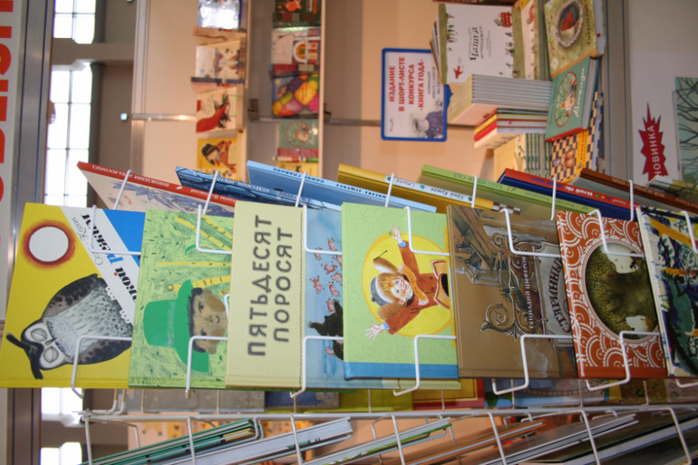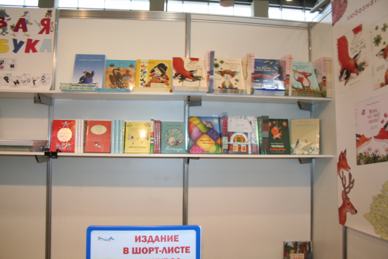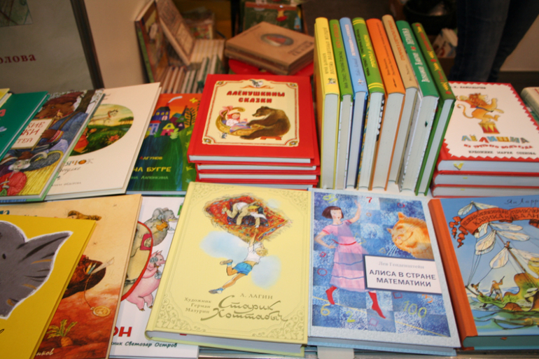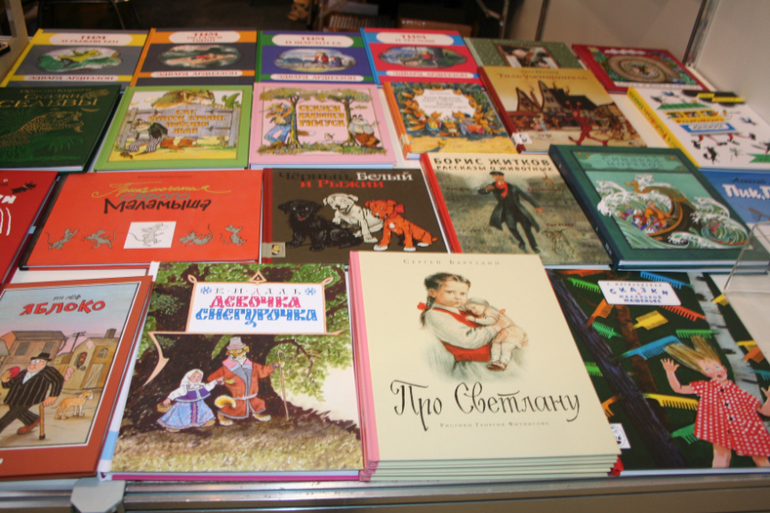 Далее я уже просто прошлась по стендам, заглянула к Мелику - Пашаеву, к Тримагу, красивые у них книги, но Мурзилка у меня уже есть, а к остальному присмотрюсь потом, так же нашла стенд Насти и Никиты, посмотрела на их новинки, сфоткала стенд Розового Жирафа, у них была коробка все книги по 100р, увидела бронзовую девушку у стенда Малыш, не знаю зачем она сидела там на стуле, прошлась по стендам других стран - Греции, Казахстана... Ничего интересного не нашла. Помню в том году выкладывали куча фоток с красивыми вазонами, коврами и прочими изысками стран Ближнего Востока, в этот раз ничего такого не было, да и детские уголки были скромными в сравнении с фотками с прошлой выставки. Наверное кризис все таки сказывается на всех. В общем самым интересным на этой выставке мне показался стенд Речи. Возможно было и еще что то, но я это не зацепила взглядом. Хотела дойти еще до стенда Детской литературы, люблю их бюджетную серию Школьная библиотека, но они где то запрятались и я их не нашла. Были они не в детском отсеке, а в другом месте. Вообщем походив минут 30 мы решили уже удаляться, так как главное сделано, книги куплены, можно и ехать, вернулись к стенду Речи, загрузили коляску 5 сумками общим весом кг 40 и поехали на выход. В итоге на выставке пробыли чуть меньше 2 часов, 40 минут из которых я провела в очереди за билетами. Но для меня этого было вполне достаточно, чтобы увидеть, то что мне было нужно и купить все по списку.