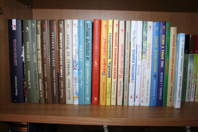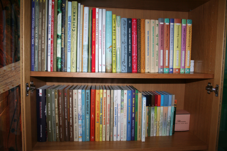 Итого покупки с выставки заняли почти 2 полки. Чтобы не падали поставила к серии Ребята с нашего двора и Вот как это было книги Детской литературы из серии Школьная библиотека ( на 2 полке в правом углу). Их я покупала не на выставке.