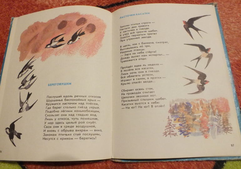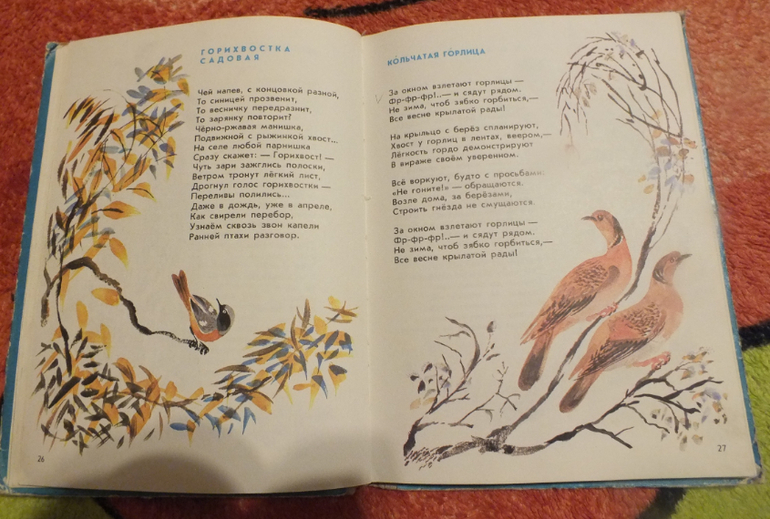 У меня дочка большая любительница птиц, поэтому я взяла не раздумывая как только книга появилась в продаже. Не сказать, чтобы у ребенка это самая любимая книга птичья, просила читать только про выпь. Но вот мне самой очень трудно читать вслух его стихи, все время спотыкаюсь. Они какието сложные, не певучие чтоли..