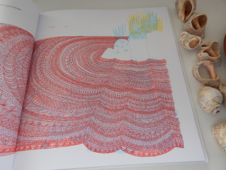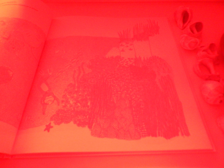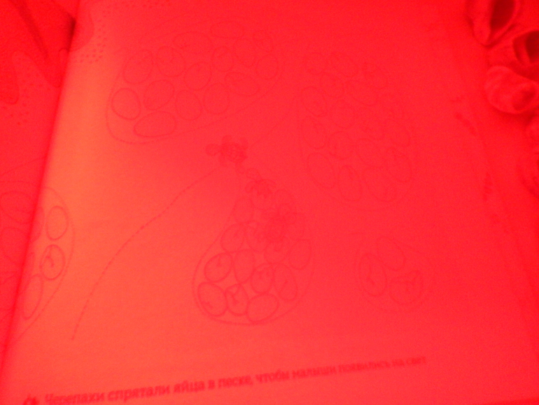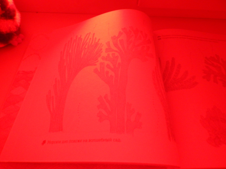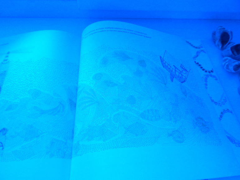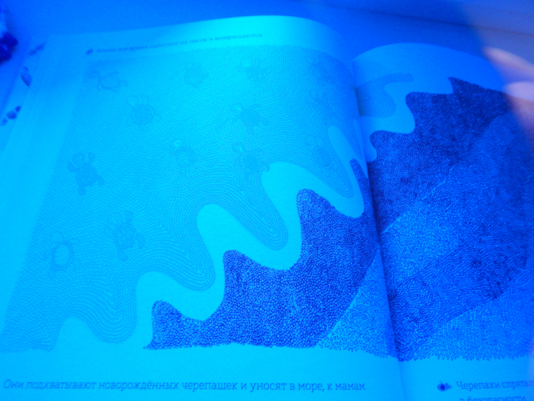 Как устроена книга? На страницах мы видим узоры красного, желтого и голубого цвета, где-то узоры непонятно переплетаются между собой, где-то видны очертания растений, волн, кораблей. Но стоит взять в руки фильтры, как мы видим совершенно другие картинки! Кстати, на фото желтый цвет очень яркий и можно без лупы увидеть что нарисовано этим цветом, но в живую цвет не такой яркий и увидеть рисунок можно, только посмотрев через лупу.