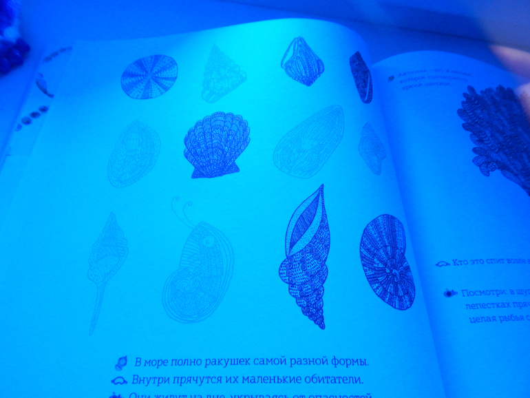 У нас конечно есть много книг с окошками и секретами, но это все же немного другое! За необычными узорами разных цветов прячутся морские жители - рыбки и рыбины, крабы, ракушки, моллюски, всевозможные морские растения, а также морские птицы и корабли, причем в каждую лупу видны разные изображения морского мира!