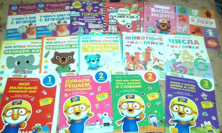 Сколько смогли впихнуть? В маленькую сумку? Мне громадная книга про цвета не дала еще книги три- четыре прихватить и детские толстенные наборчики книг,но все равно я довольна