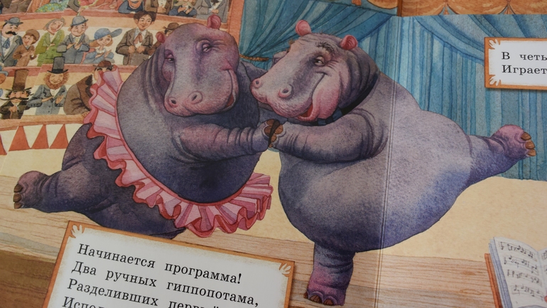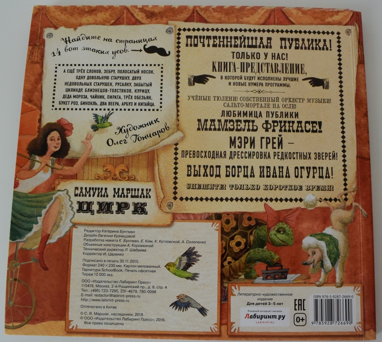 Ах, этот старый добрый цирк. Стилизация иллюстраций под ретро, ощущение слегка (совсем чуть-чуть) поблекших красок... Раскрой сюда, разверни здесь, а вот тут покрути... Стихи.. этот язык... Так больше не пишут:))). Услада для ностальгирующих родителей и более старшего поколения. Блеск и интерес в глазах детей и воспоминания: "Мам, мы были в цирке только 1 раз. Ты же обещала вернуться туда. В цирк самого доброго клоуна в мире (это про Никулина в нашем доме так говорится)!"