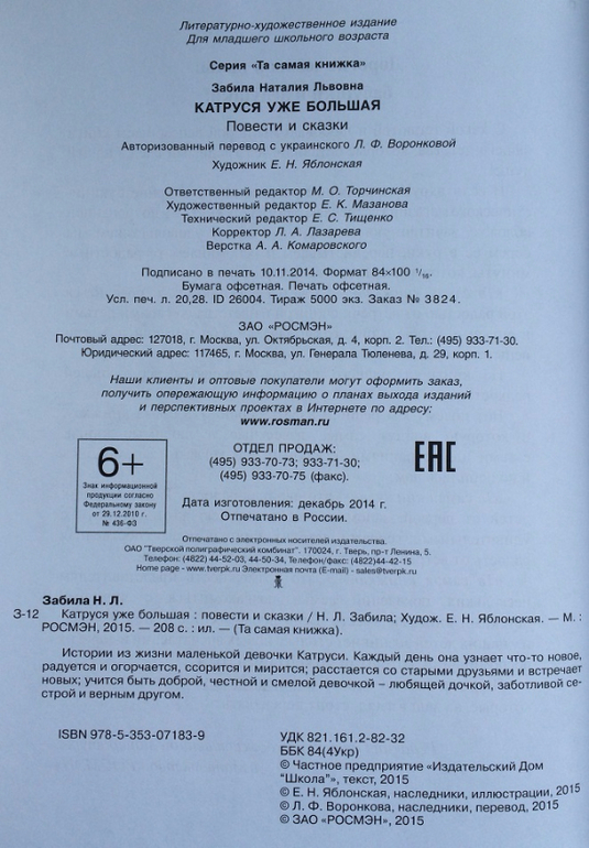 Шрифт крупный, четкий (подойдет для самостоятельного чтения); печать хорошая; листы средней плотности; корешок нужного размера - книга открывается нормально, не болтается в обложке; обрез ровный; ляссе и суперобложка отсутствуют; переплетная крышка глянцевая твердая (картон); тиснений на обложке нет; форзац белый; фронтиспис (рисунок в самом начеле книги ч/б); рисунков много, но все ч/б и основном на половину страницы или на четверть, шмуцтитулы тоже ч/б и, как и положено, предваряют каждый раздел. Остальное можно увидеть на фото.