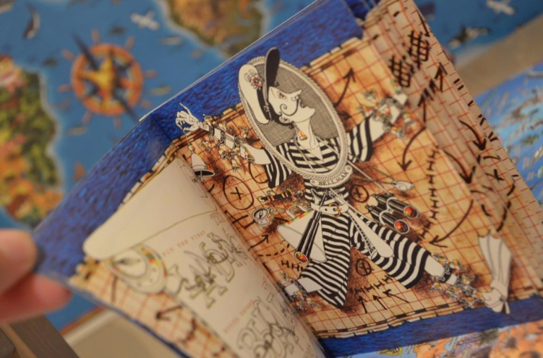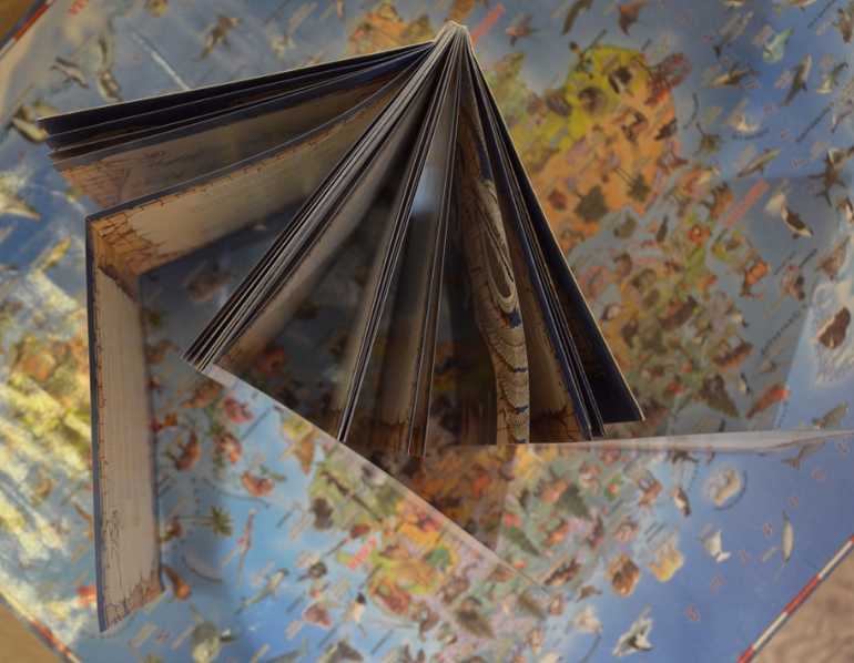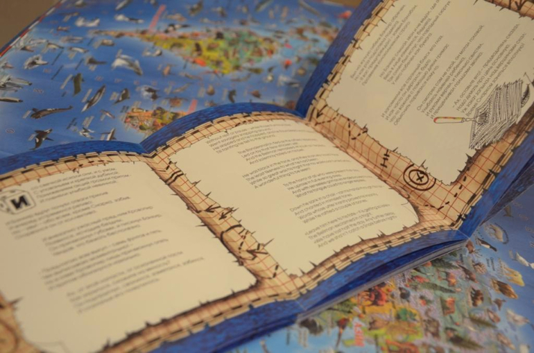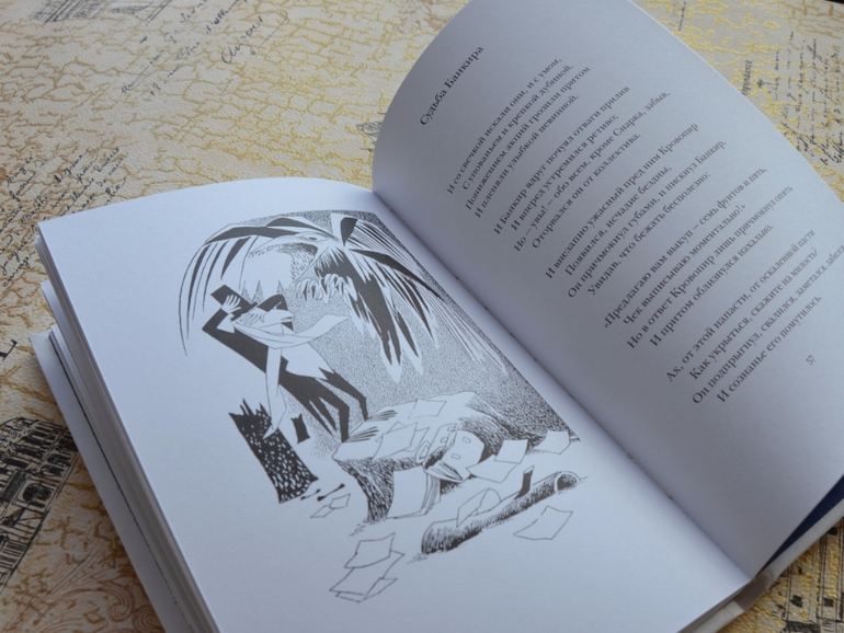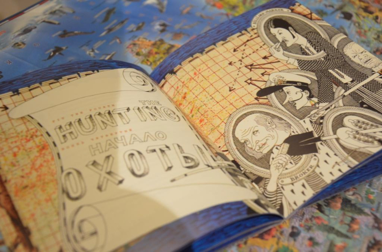 Проиллюстрировал его мой земляк, Иркутский художник, Сергей Элоян, заслуженный художник России. Издавалась книга в Икрутском издательстве «Время странствий» в 2006г. Тогда эти все мелочи были пустыми словами, сейчас же, когда я уже много лет живу на новом месте, приятно держать такую книгу в руках. Книжка квадратного формата, похожа на судовой журнал, каждый новый вопль ориентирован наоборот, т.е. книгу нужно постоянно крутить книгу. Издан «Снарк» на английском и русском языках, а некоторые страницы складываются пополам, вот так: