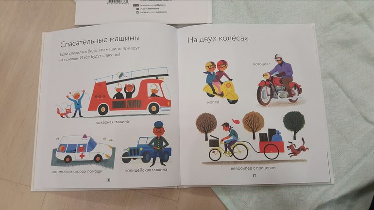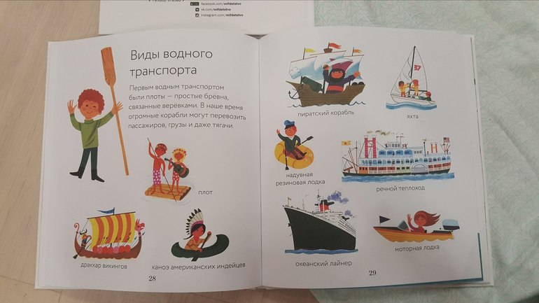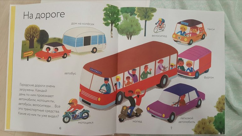 Вот эту книжку я и сама с удовольствием рассматриваю. Так как очень мало знаю о транспорте и мало им интересуюсь. А здесь чего только нет. И про то, как устроен автомобиль, и про виды спасательных машин, и водный транспорт, грузовики, самолёты, корабли, как работают аэропорты, вокзалы и метро, что находится внутри самолёта, катера и даже транспорт в космосе.![]()