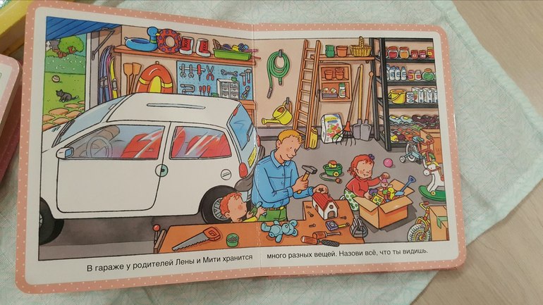 На основе книг этой серии я уже придумала своего рода игры на будущее. Например, покажи, где спрятался кот, найди мишку, посчитай, сколько на кухне чашек и т.д.