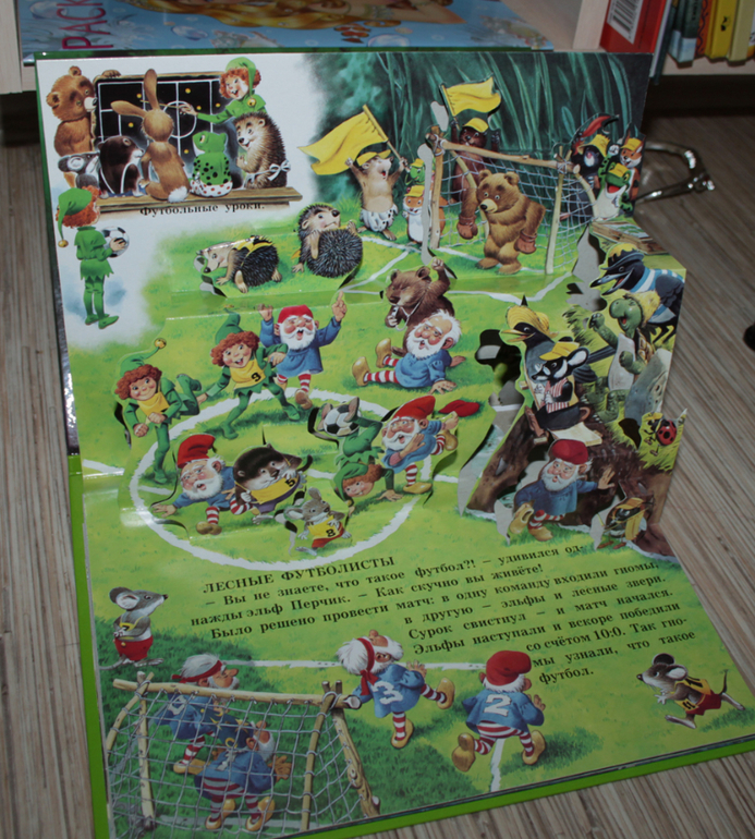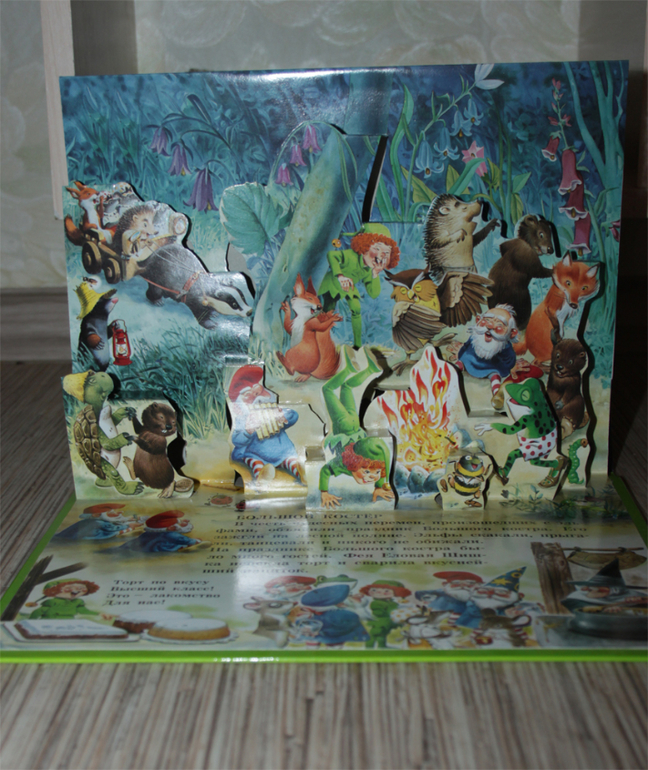 Вот всё вроде должно срастить - картонка, панорамка, про любимых гномов, иллюстрации Тони Вульфа. Но нет, дальше первой страницы прочитать не смогли. Иллюстрации посмотрели все, это да. Но тоже только 1 раз. Потому что книг-картинок у нас много и без неё.