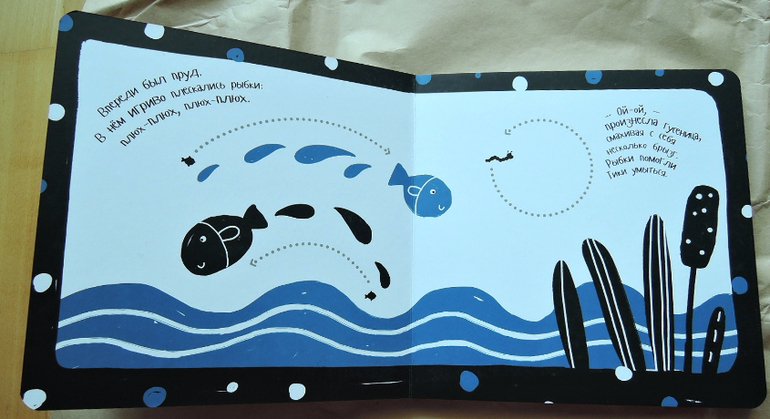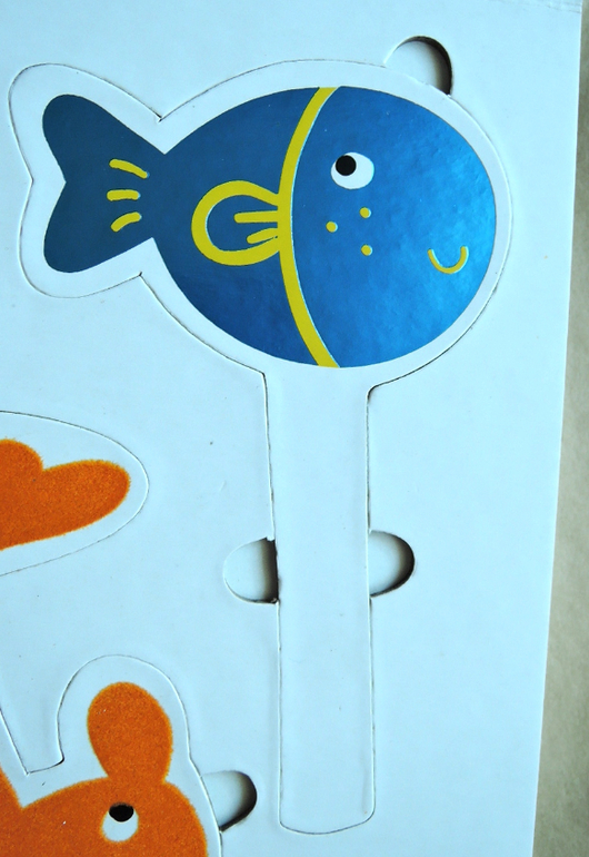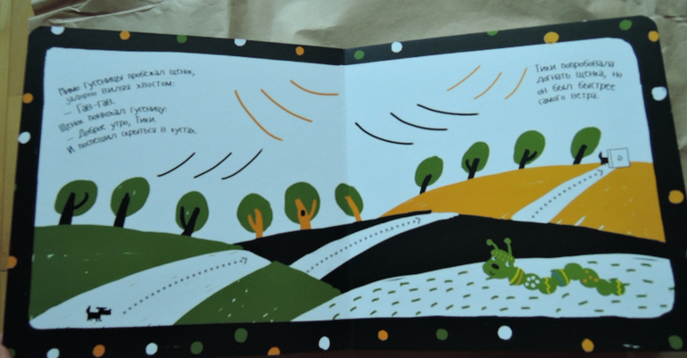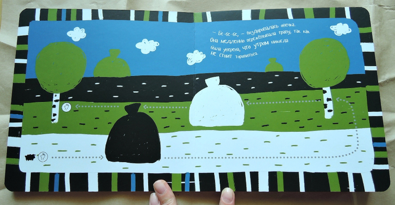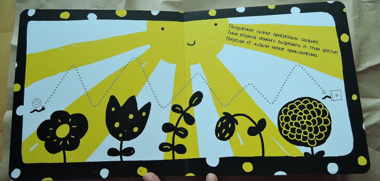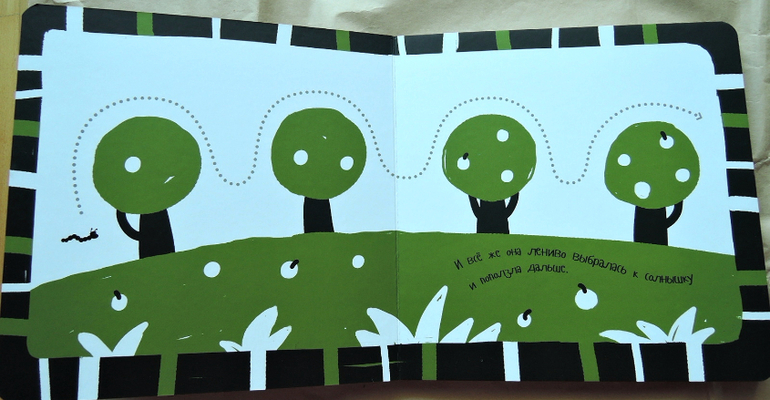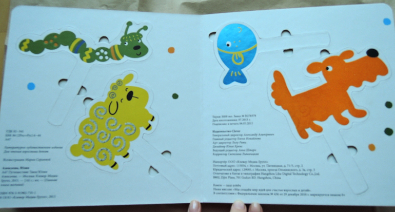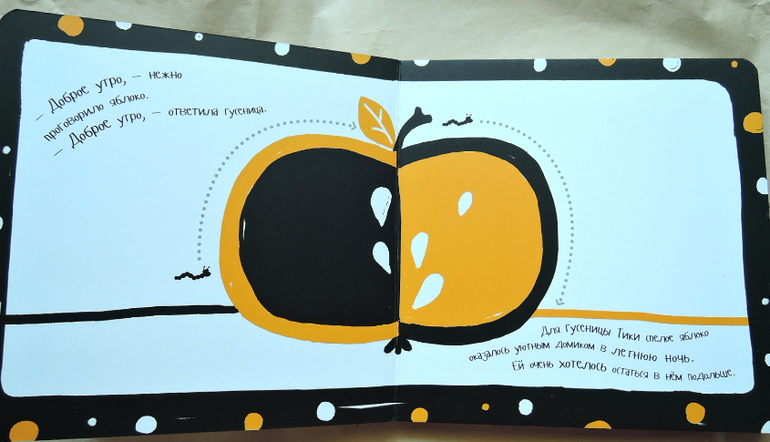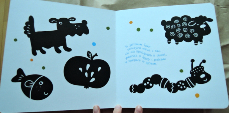 Прочитав только первую фразу "Доброе утро! - нежно проговорило Яблоко" я поняла, что книжка мне понравится. Довольно контрастные картинки, проводилки, выпуклые детали, 4 игрушки-героя книги на палочках. Всё вместе рассчитано как раз на первые игры мамы с малышом и знакомства с книжками. Но только под наблюдением мамы,иначе эти игрушки сгрызутся очень быстро;)