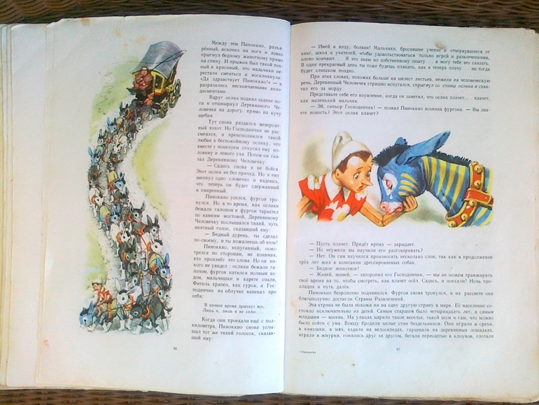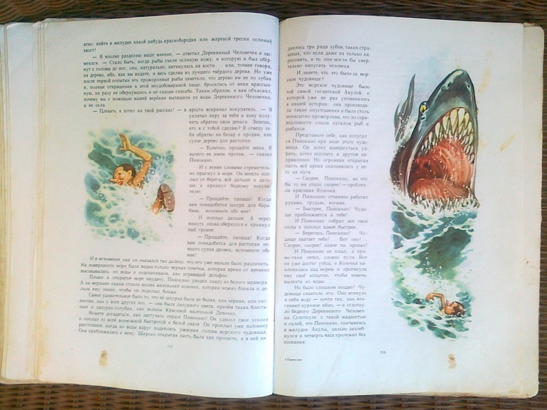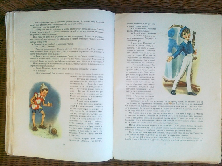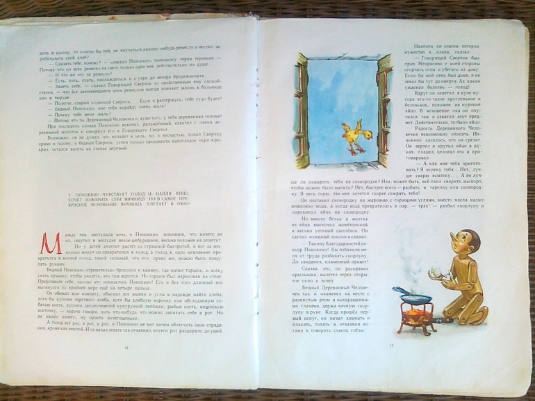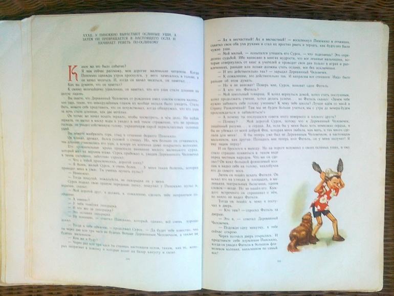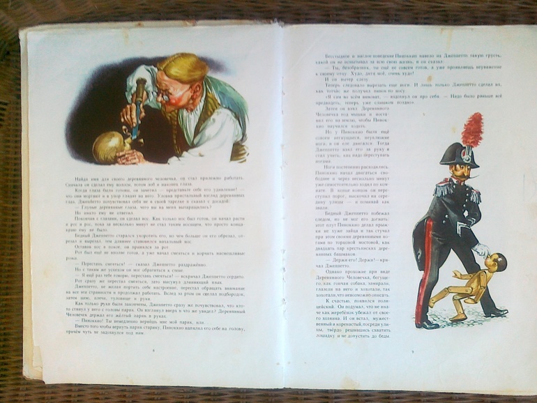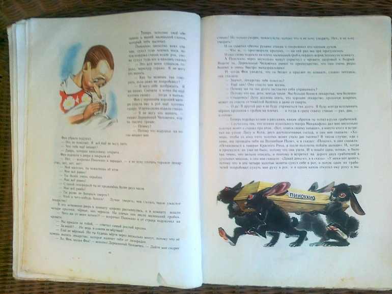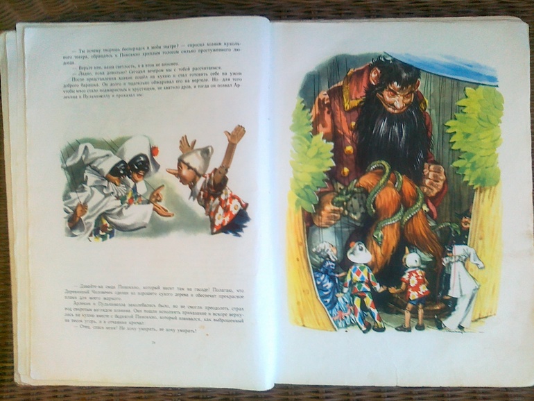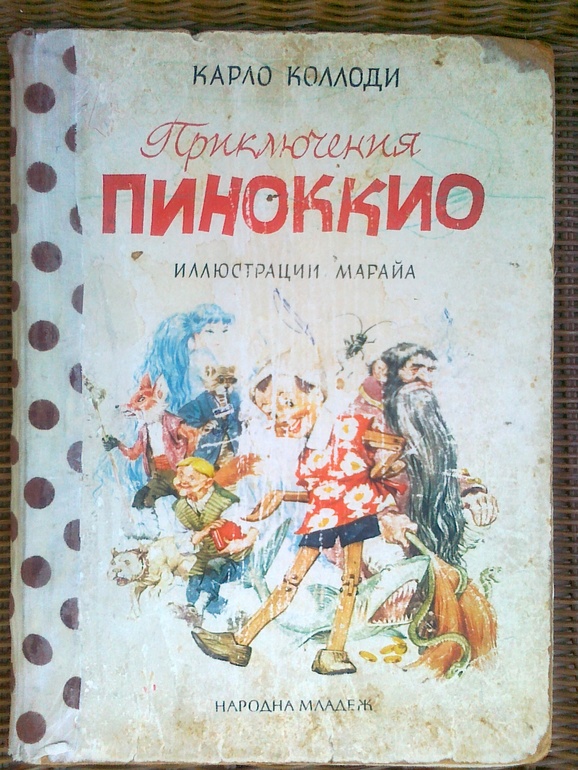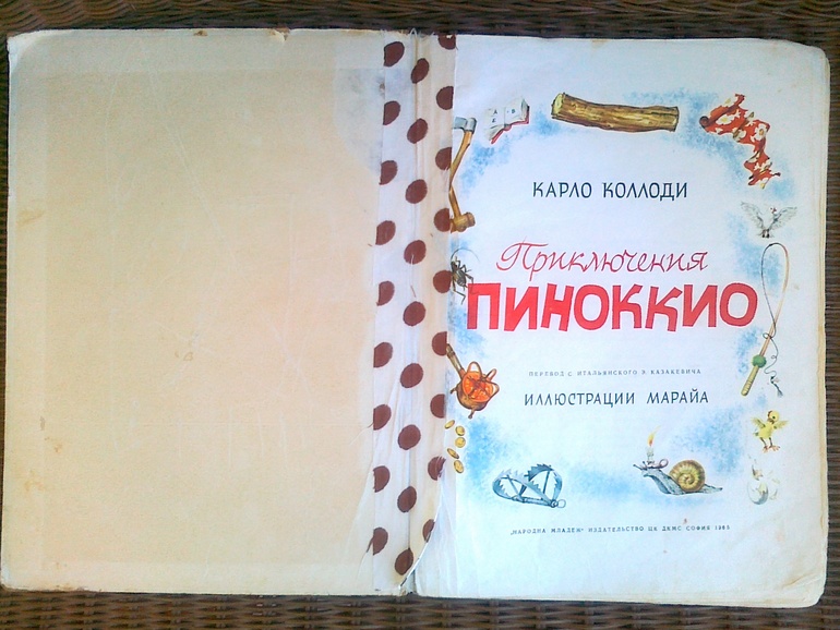 Это классика детской итальянской литературы: Карло Коллоди. Приключения Пиноккио. Книга - раритет. И в смысле издания: издана болгарским издательством "Нардна младеж" в Софии аж в 1965 году! С шикарными иллюстрациями Марайа! И ещё эта книга выдержала пять поколений читателей!! Вернее, уже шесть - Соне мы её уже раз пять читали точно)). Она, конечно, натерпелась бедная... Потому что представители двух поколений точно ) пытались иллюстрировать её по-своему и так увлечённо листали страницы, что книге пришлось поменять родной корешок на тряпочку в горошину)). Но, конечно, хуже она от этого не стала. Мне даже интересно представлять, как Дима маленький листал своими маленькими ручками именно эти листочки, которые с удовольствием листает Сонь, как он восторгался именно теми же иллюстрациями, и как боялся тех же картинок, что и она....