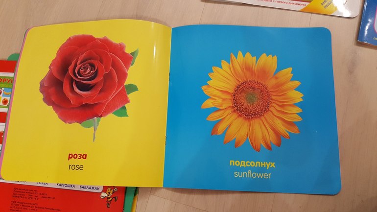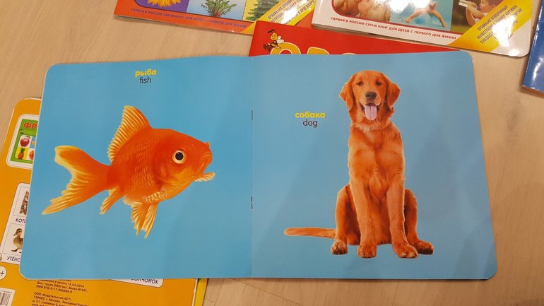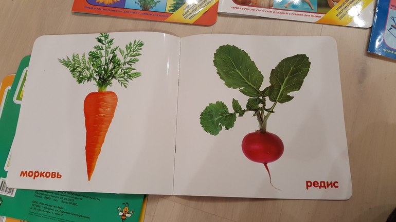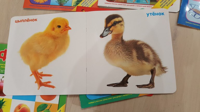 Сами книжки достаточно большие (29 на 29 см). Картинки в виде очень правдоподобных фото. Не всё в серии мне нравится, но в целом приобретением довольны. Фаворит у Ани в 11 месяцев Фрукты, Овощи и Детеныши животных.