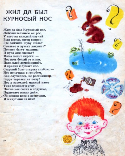 Это была моя самая любимая книга детства, эти стихи я знала наизусть лет с трех, но...я подросла, книга пошла по родственникам, и так ко мне и не вернулась. И вот, годы спустя, когда у меня у самой появились дети, я начала искать эту книгу везде - и не нашла. Книга не переиздавалась, да и об авторе уже, похоже, давным давно все забыли. Даже здесь, на бб, поиск по фамилии автора ничего не дал. И как так получилось, что такие совершенно замечательные стихи канули в небытие - совершенно мне не понятно. А ведь стихи и в самом деле замечательные! К счастью, сканы некоторых страниц я нашла в интернете. Распечатала, трепетно сложила по листику в папочку, и вот читаю уже третьему ребенку. Кстати, стихи не просто чудесные, но и на удивление легко запоминающиеся. Даже мои, совершенно не склонные к разучиванию стихов, дети, именно эти стихи запоминают на лету и, как и их мама десятилетия назад, могут совершенно из ниоткуда начать бормотать про себя "жил да был курносый нос".