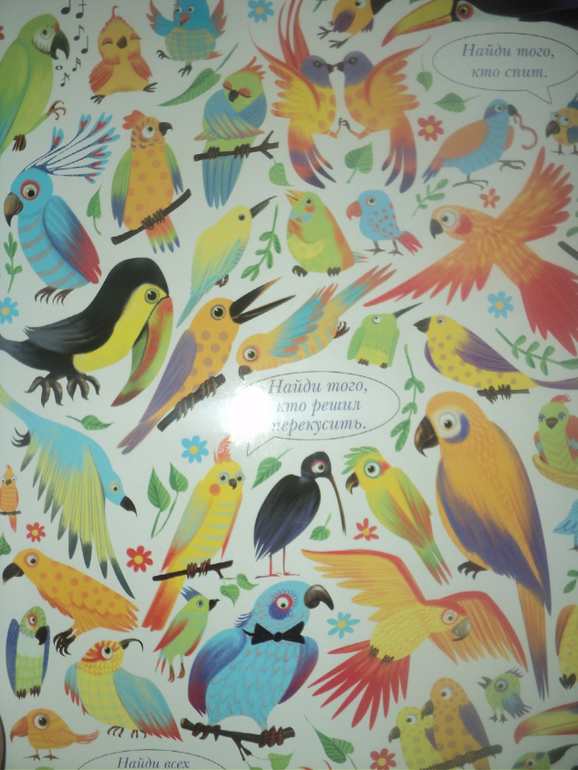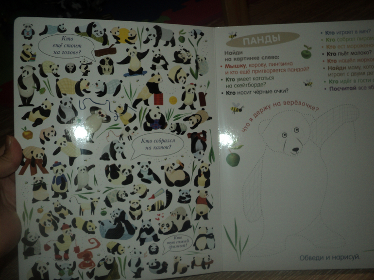 Находкой в "Детском мире" для меня стала книжка "Найди, покажи, дорисуй". Это система заданий на внимательность. На каждой страничке расположены животные , птицы, насекомые одной группы, но в разных деталях и лицах) Например, все панды или бабочки. И среди них нужно найти согласно заданиям самых маленьких, больших, лишних, в одежках и прочее. В книге даже можно рисовать водными фломастерами.
