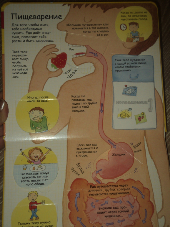 Следующая книга - "Секраты человека". Изучили все строение тела. А самая любимейшая страничка о пищеварении. Сын понимает, почему так важно хорошо мыть руки, делая перчаточки из пены, почему нельзя есть немытые овощи и фрукты, знает, как продвигается по организму пища, где находится сердце и желудок и много другое.