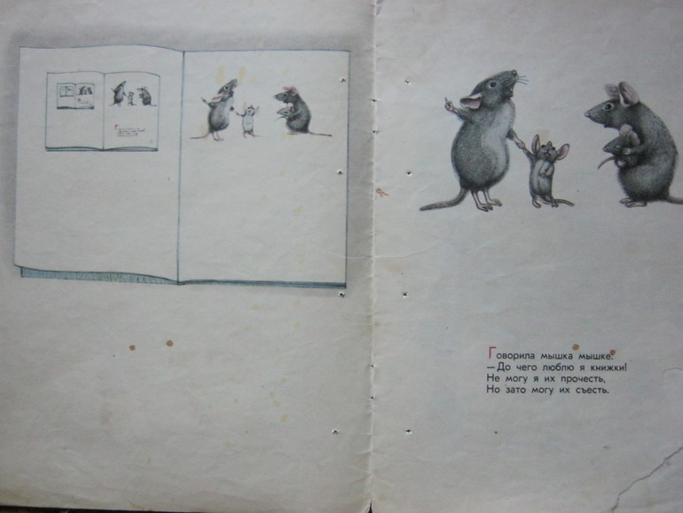 Она открывалась разворотом с премилыми мышками, мышонок много раз переводился с помощью копирки, у которой я вечно путала нужные стороны и поэтому на многих книгах остались следы на обратных сторонах страниц с картинками.