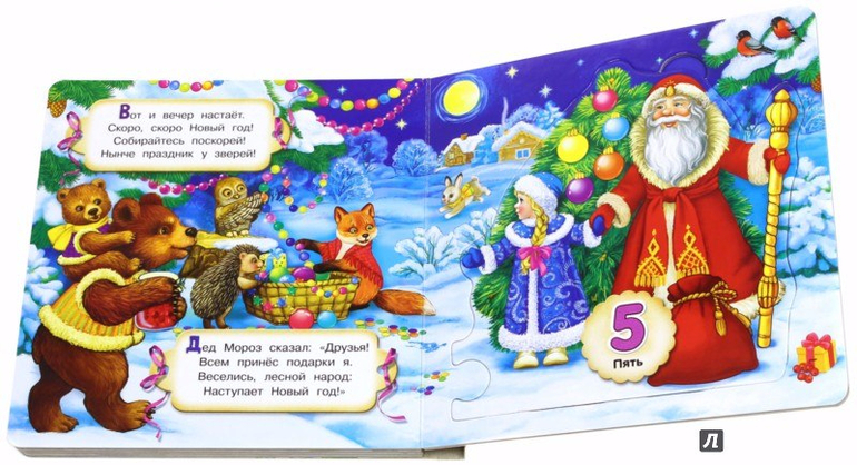 Большие яркие пазлы помогут малышу собрать лесных друзей у новогодней ёлки, а заодно выучить цифры от 1 до 5.