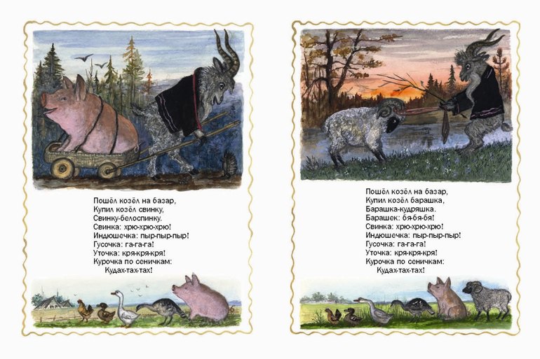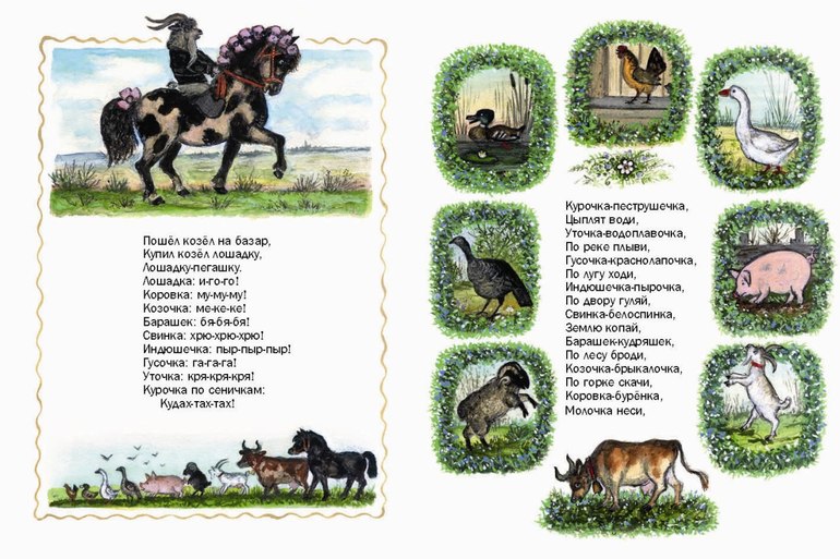 Эта песенка поможет малышу запомнить названия, внешний вид и повадки домашних животных, а ещё она хорошо подходит для совместной игры с другими детьми или игрушками. А иллюстрации Юрия Васнецова перенесут родителей в их собственное детство.