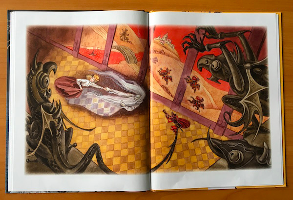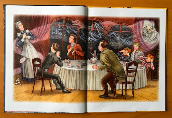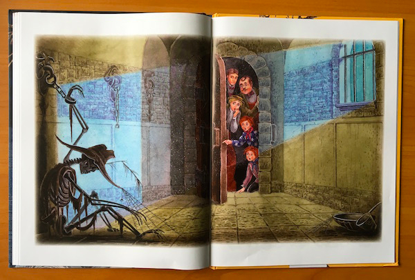 Вот эта иллюстрация, насколько я понимаю, была нарисована заново. Сюжет тот же - все находят скелет сэра Симона. Но в старом издании он тянется к тарелке в страхе умереть голодной смертью, а тут он уже повесил голову - он обречен быть в заточении, пока чистое, доброе сердце не поможет ему обрести свободу.