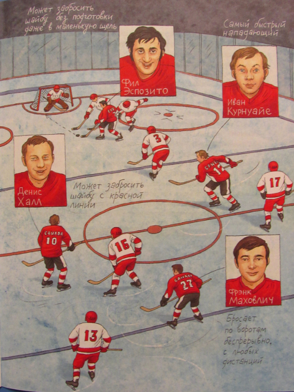 Или о том, что Владислав Третьяк очень хотел получить хоккейную форму, которой на всех не хватало. И набравшись смелости, он подошёл к тренеру и сказал, что если ему дадут настоящую форму, то он будет вратарём. Так Владислав Третьяк стал вратарём.