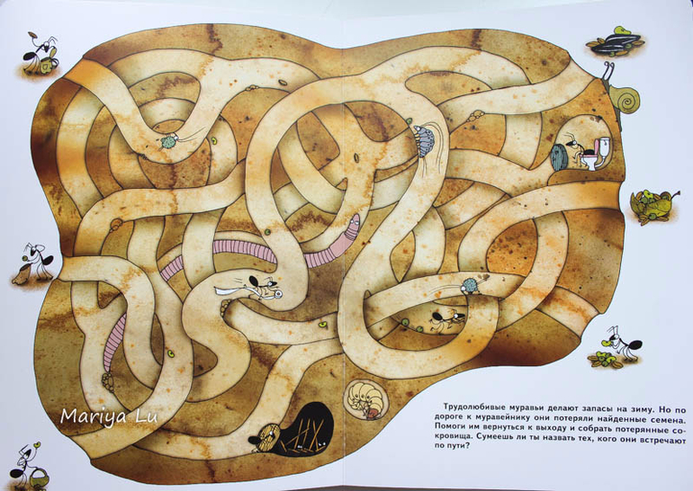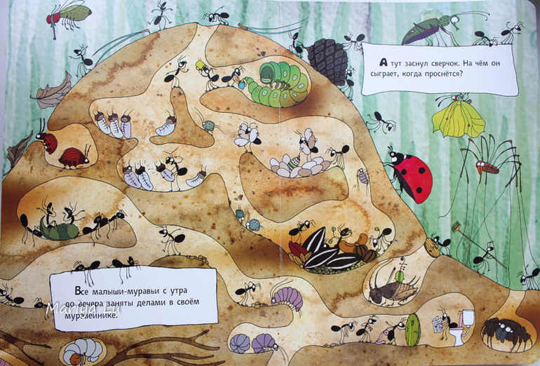 Эта книга - моя любимая из серии. вовсе не потому,что я обожаю муравьев , червячков, улиток, паучков и жучков. Я просто люблю подглядывать :) Действительно, на разворотах такое количество норок и ходов, что книга уж точно удовлетворит мой интерес. А у трехлетнего сына( именно в этом возрасте у нас появился немецкий экземляр) накануне лета интерес был разогрет как раз этой книгой, собственно, второй год он и продолжается. И пришедший экземпляр он встретил восторженно , старенький то мы отдали такому же юному энтомологу.