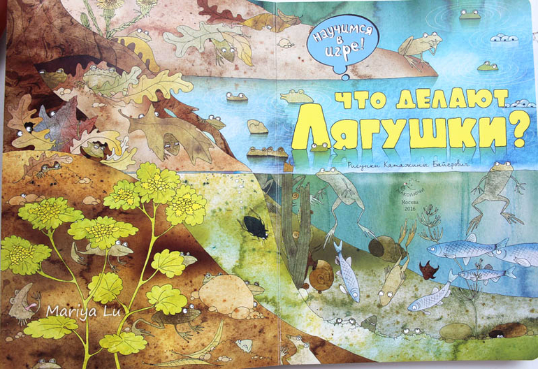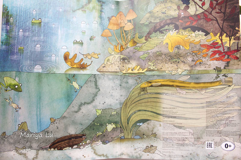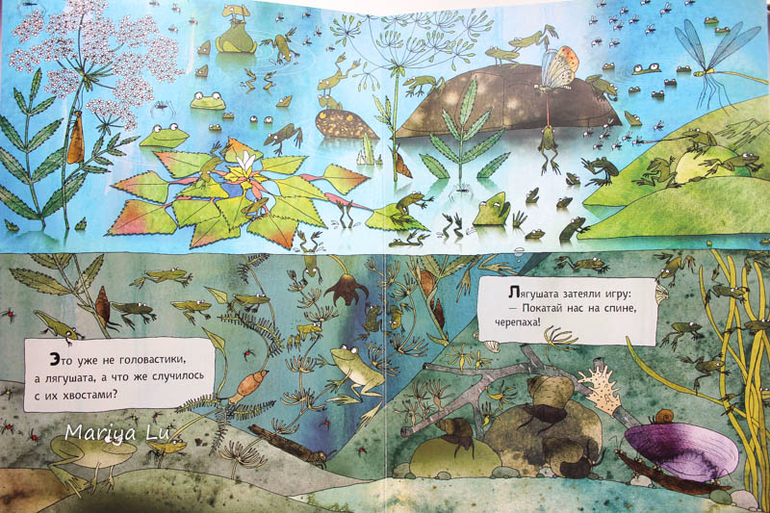 Основная тема ,конечно же, квакающие создания. Внимание!!!! в завязке сюжета развития квакушек присутствует тема "секаса" ( см. третий разворот), но они там все такие довольненькие, что могу сказать точно - по любви, никак иначе! Лично я не отношусь к категории мам,которые восклицают "госпадибожемой" закрывают книгу и несут ее из дома прочь. Считаю,что естественно и прилично показано, то не безобразно, а уж под каким "соусом" преподнести информацию зависит только от взрослых. Сама в начале лета объясняла юному пытливому уму откуда берутся игринки и зачем они так сидят.