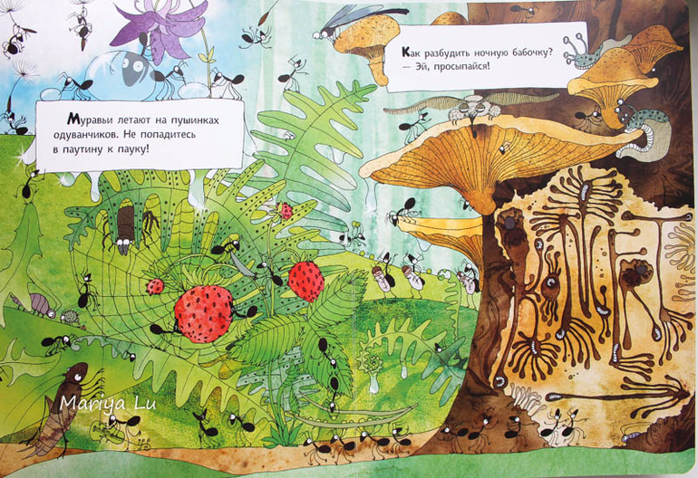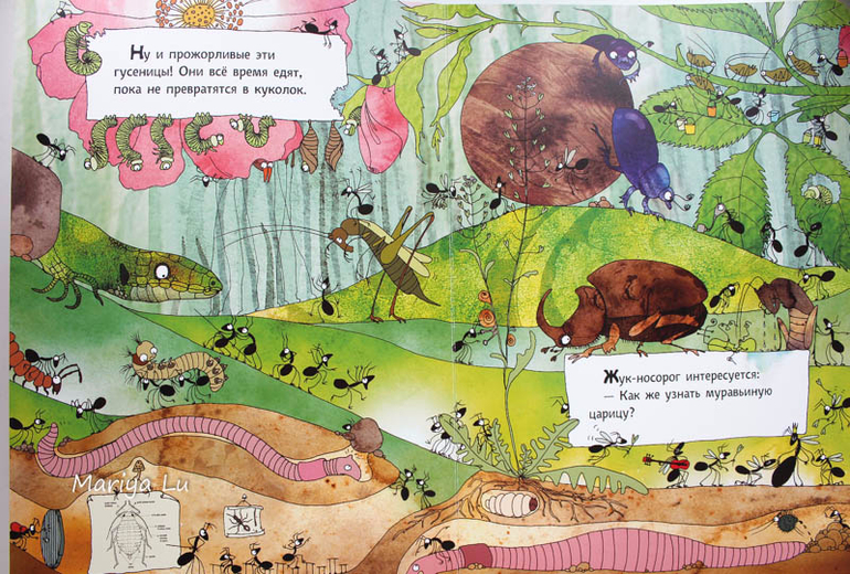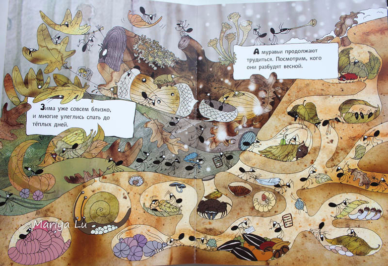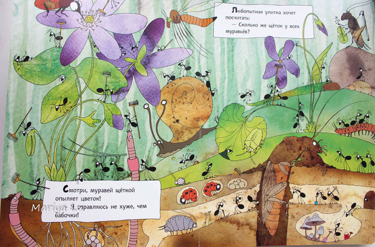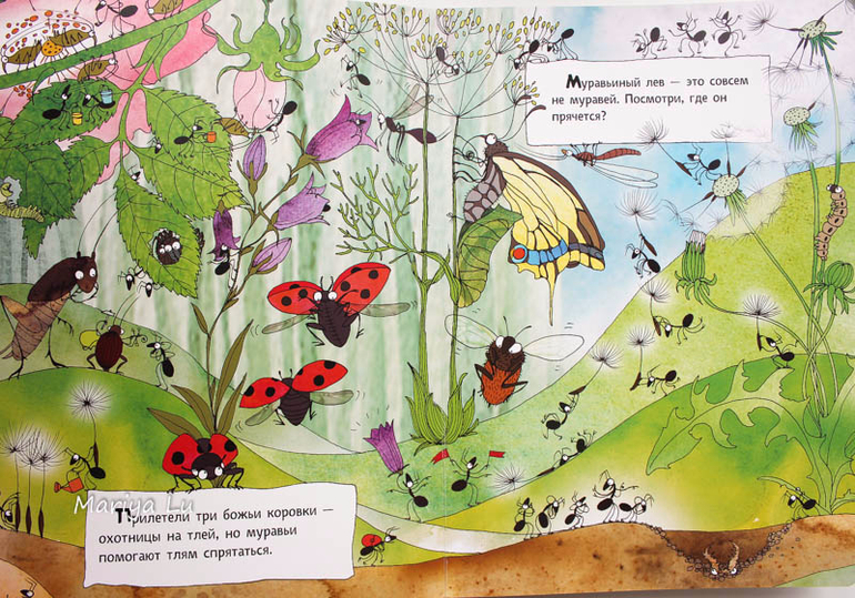Основные персонажи, как вы уже поняли - муравьи. Но они здесь не одни. На страницах найдем и божьих коровок и червячков, бабочке, улиток. узнаем как они появляются ,проводят лето и зимуют.