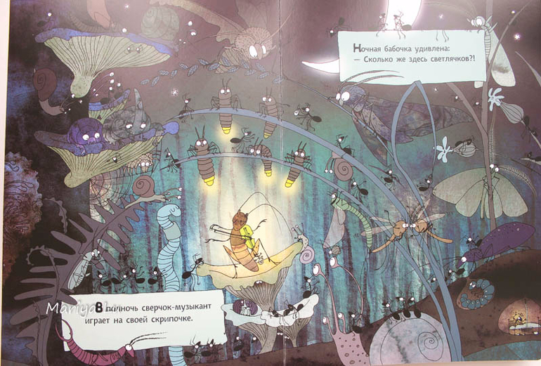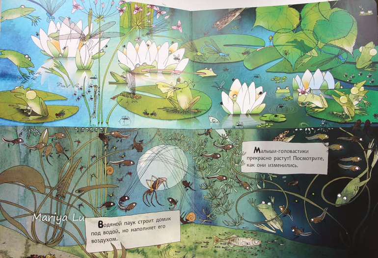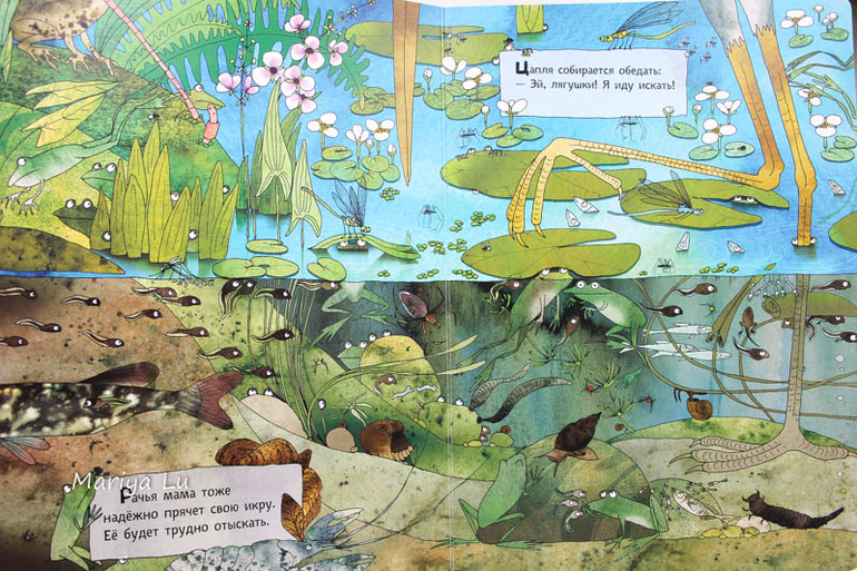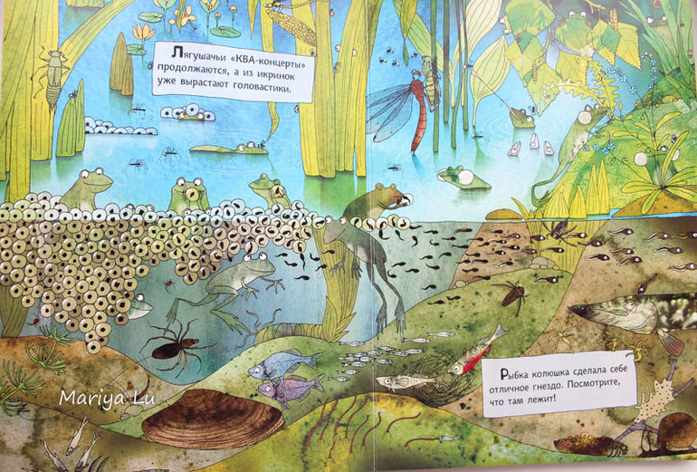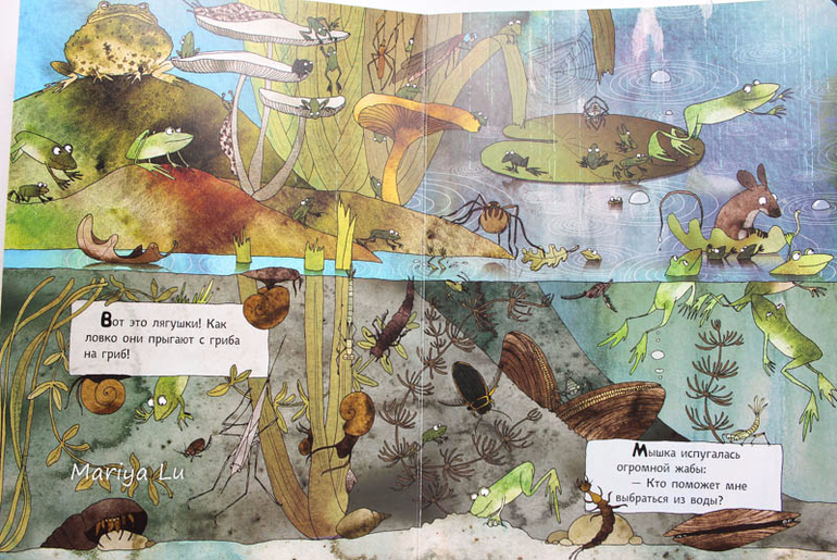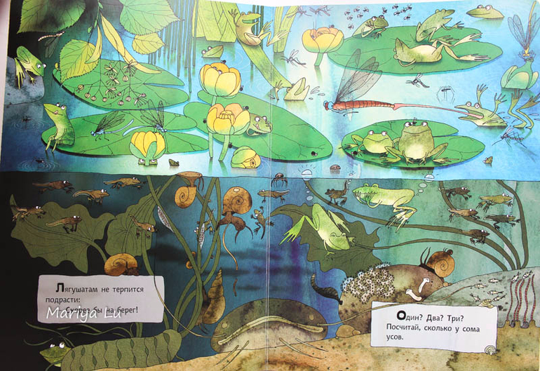 Водяные лягушки не столь любимая тема сына, он больше по земляным специализируется. Но все же книга дала нам лишний повод обсудить жизнь в водоеме или болоте ( что для пригорода СПб более близко), найти знакомых насекомых и проследить их от этапа личинки и до взрослой особи. Толика юмора в рисунках Катажины даст повод улыбнуться,ведь она некоторые моменты довольно четко подметила. Сына позабавили лягухи с музыкальными инструментами, ведь мы практически каждый вечер слушали их концерты во время прогулки, а заинтересовали паук со своим воздушным домиком и пиявки. (брррррр.........)