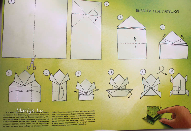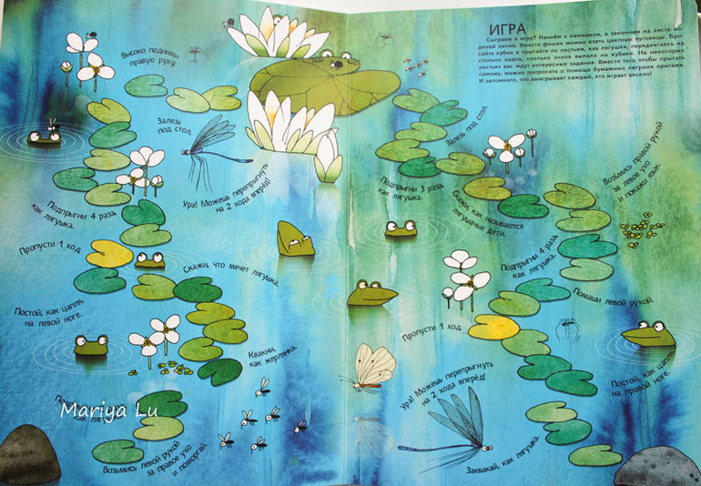 Книга про лягушек отличается от книги про муравьев, здесь представлены целых 2 разворота с энциклопедической информацией : про обитателей водоема и про виды квакающих созданий. Кроме заданий на страницах (посчитать, ответить на вопросы),также добавлены развороты со схемой оригами -лягушки и с вполне удачной игрой-ходилкой. В качестве заданий предлагается ответить на вопросы, попрыгать, залезть под стол, постоять как цапля и т.д.