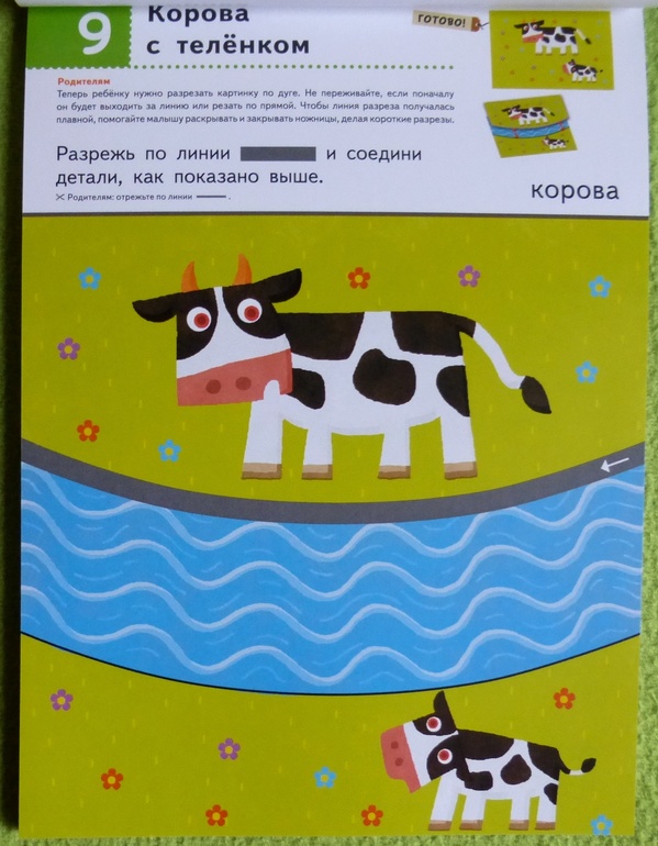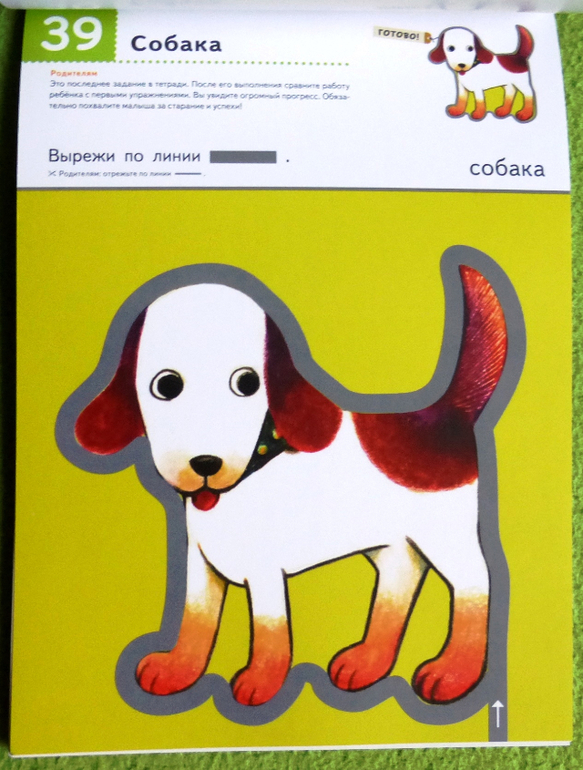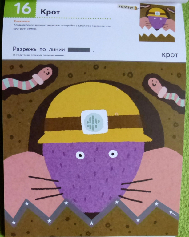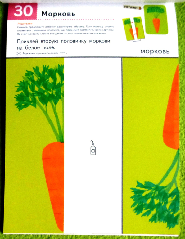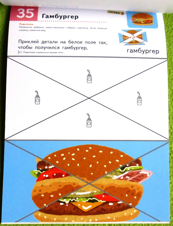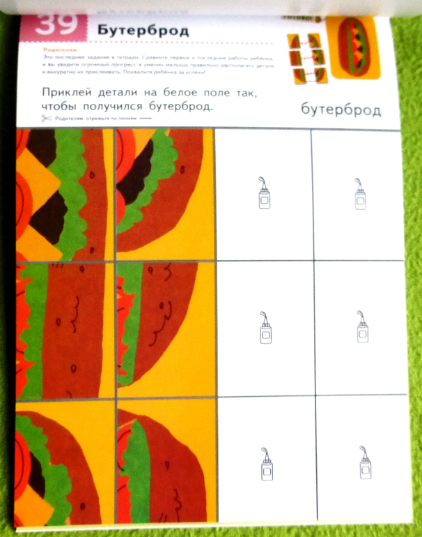 К концу тетради задания усложняются и ребенку предлагается собрать картинку из 6 деталей, приклеив их на лист