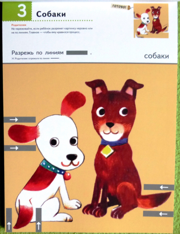 Далее даются задания на прямые и дугообразные линии. Разрезав на части, предлагается собрать элементарный пазл из 2-4 деталей