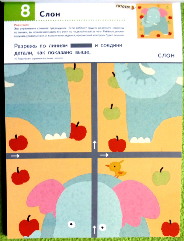 В последующих заданиях ребёнку предлагаются упражнения на «собирание» не всей картинки, а одного предмета из нескольких частей.