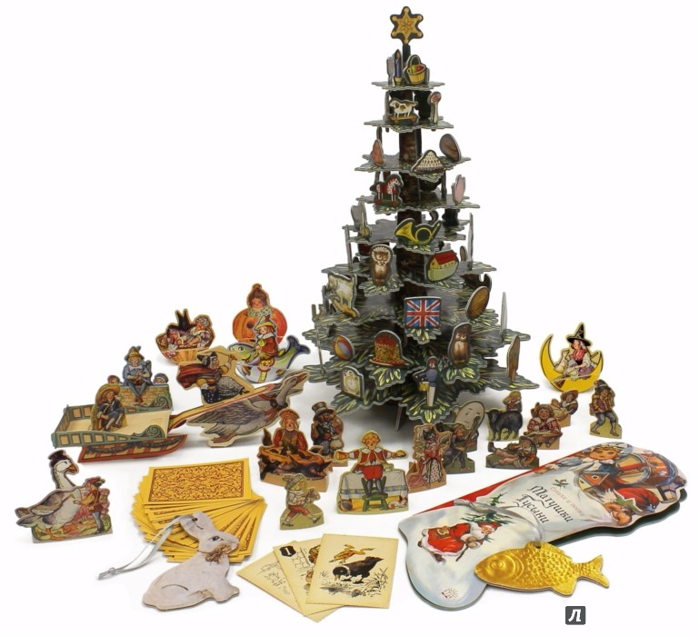 7 листов картона разной плотности с моделью елки, игрушками, качалками, картами. Книга с фигурной вырубкой, 20 с.