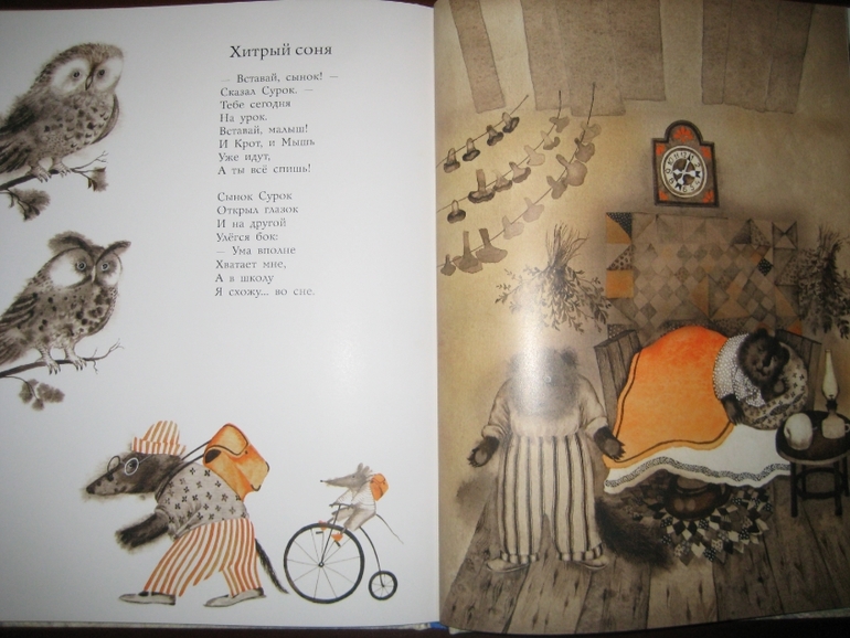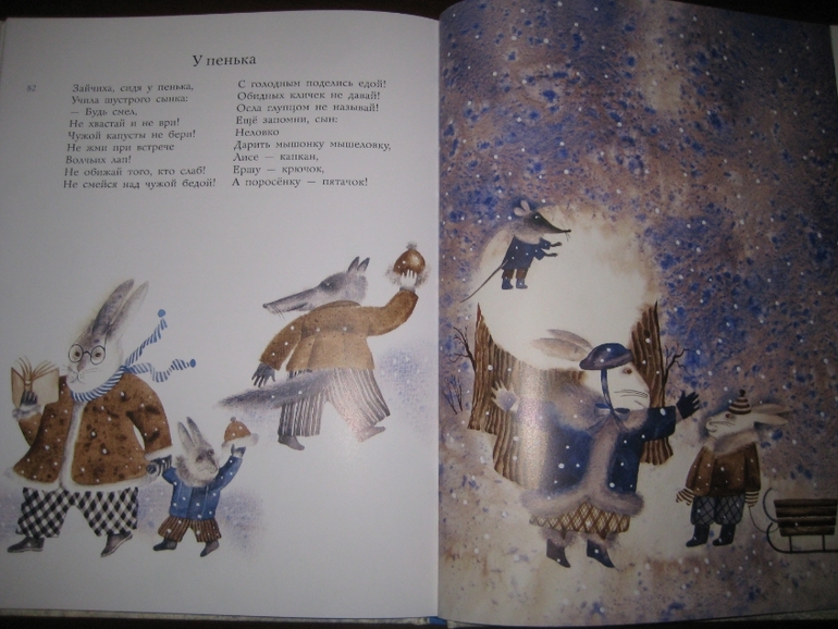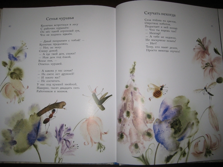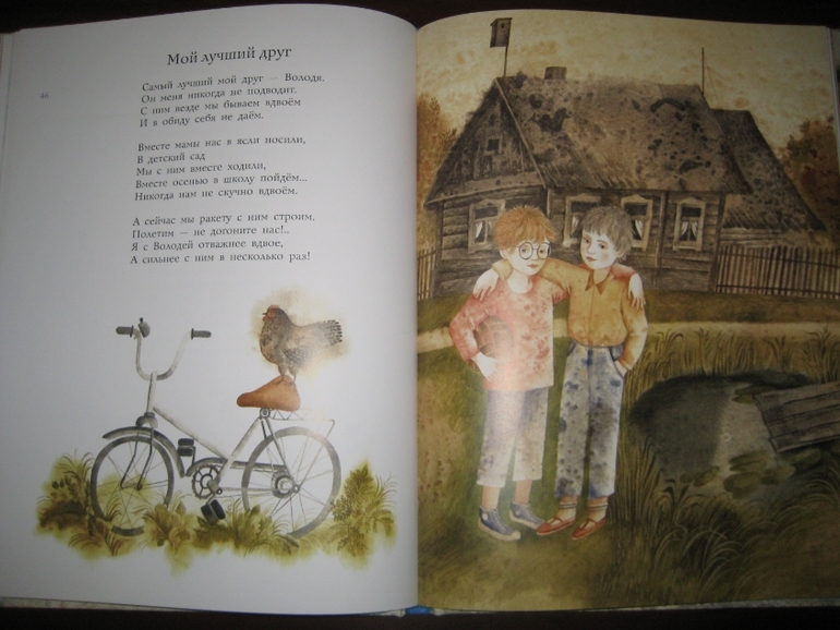 Особого упоминания заслуживают иллюстрации Веры Павловой. Приглядитесь к ним, держа в голове вышеприведенное стихотворение "Буду пограничником". Ну как? Есть хоть намек на гармонию? Мягкие линии, размытый фон, нежность в рисунках, угловатость, как будто ребенок рисовал несмелой рукой... Но странно: иллюстрации вроде бы идут вразрез с текстом, но совершенно не возникает ощущение диссонанса, они как будто заведомо берут на себя задачу снизить градус торжественности некоторых стихотворений, с одной стороны, и придать мягкость ироничности других. Тем самым, как мне кажется, решается весьма непростая задача - достигается органичное единство сборника. Судите сами: