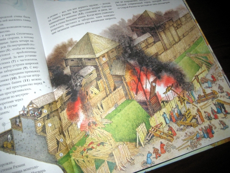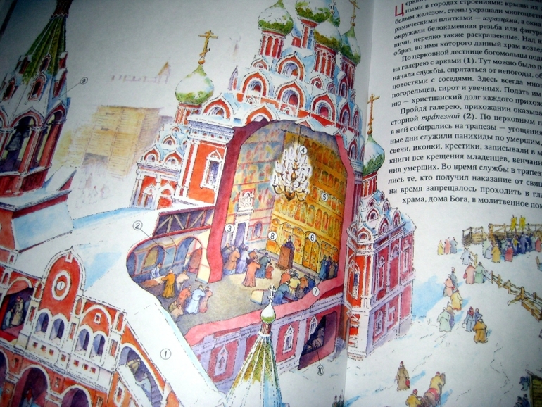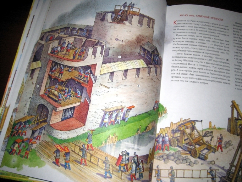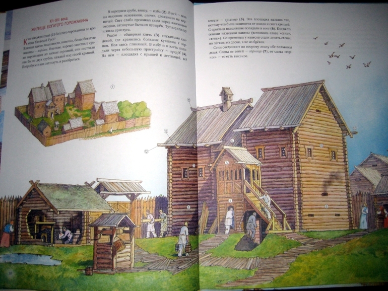 Повествование выстроено по хронологическому принципу и охватывает период строительства на Руси разного рода сооружений начиная с VIII и заканчивая XVII веком. Иллюстрации прекрасно вписываются в текст и идеально гармонируют с содержанием, его поддерживая: здесь не просто картинки, здесь полноценные схемы, строения в разрезе со всеми необходимыми пояснениями: