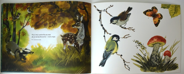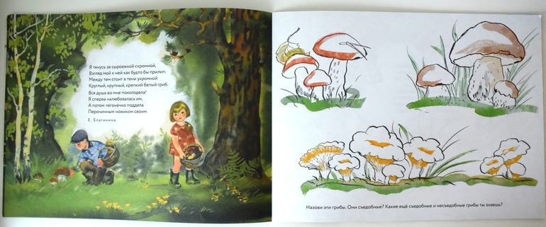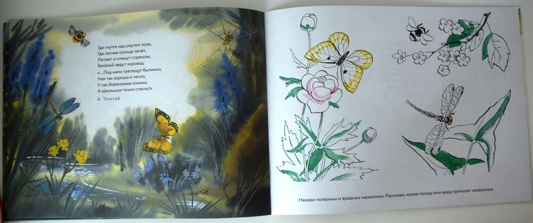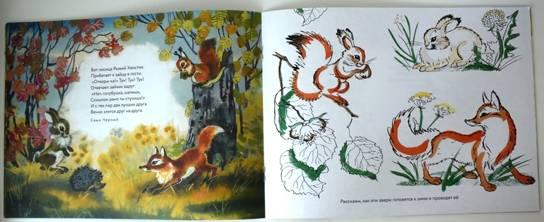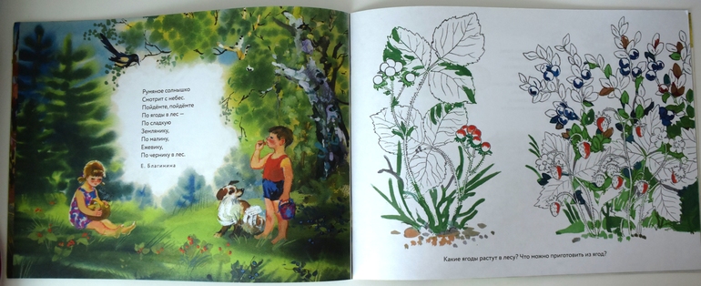 Так здорово, что наряду с переизданием тоненьких книжек из нашего детства стали переиздавать подобные альбомы для раскрашивания. Я приобрела у "Стрекозы" один альбом на пробу, чтобы посмотреть качество печати. И оно очень даже порадовала. Развороты получились сочными. Здесь мы видим и стихи известных поэтов, и страницы, где уже нанесены первые мазки. Осталось только быстро достать из ящика акварель и кисти. Открою секрет: в нашем доме они не убираются со стола:))) Потому что рассматривая/читая книги дети часто альбом пододвигают поближе. А дочка в последнее время, просыпаясь, бежит за рабочий стол одного из братьев, вскарабкивается на стул (напоминает Машеньку из сказки "3 медведя") и кричит: "Ика будет овАть" (Вика будет рисовать). И тут самое главное успеть раньше спрятать неубранные школьные тетради и учебники мальчишек. Т.к. желание рисовать у дочери очень сильное:)))