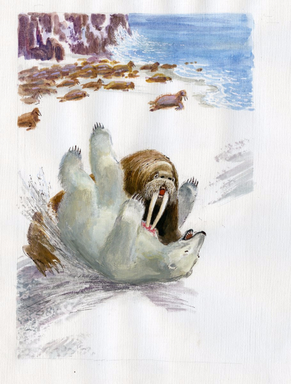 "Наше издательство готовит к изданию повесть С. Б. Радзиевской "Остров мужества". Иллюстрации к книге выполнены Б.М. Косульниковым. Повесть «Остров мужества» рассказывает о подлинной истории из жизни четырех поморов, оказавшихся на острове Шпицбергене. Смелые русские промысловики - поморы с севера русской земли, уже несколько сотен лет назад, не боясь опасностей, уходили в море ловить рыбу, бить тюленей, моржей. Иногда добирались они и до дикого заполярного острова Шпицбергена (поморы называли его Грумант). Там в то время водились во множестве моржи и тюлени. Поморы уходили на больших лодках - карбасах, с вёслами и парусом из оленьей кожи. Трудна и опасна была их жизнь.