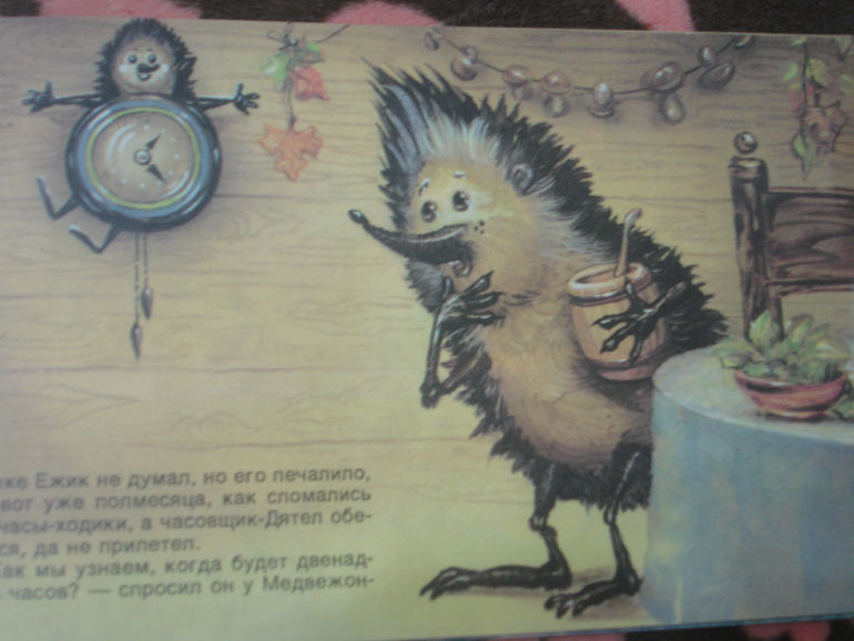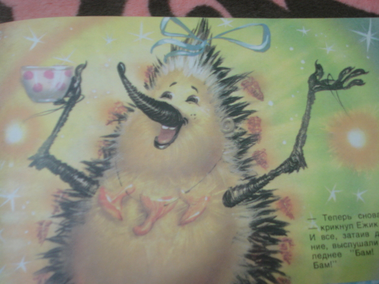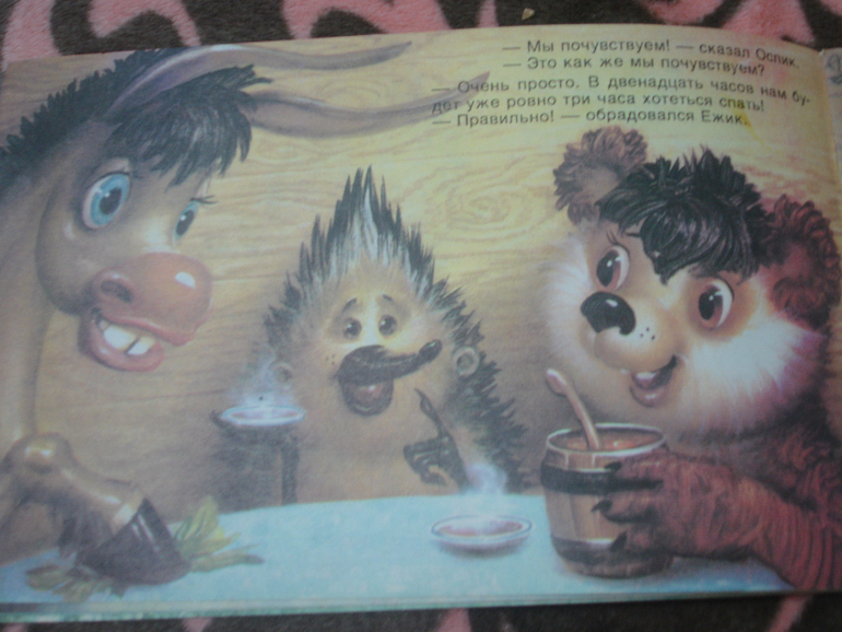 "Ёжик-ёлка" - ещё моя. Сейчас эта сказка называется "Как ослик, ёжик и медвежонок встречали Новый год". На первый взгляд темновата, но жёлтый цвет отлично передаёт атмосферу маленькой норки, освещённой свечами. Посмотрите, какие добрые герои и интересные детали: