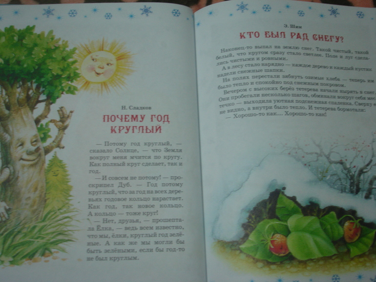 Есть пара коротких рассказов и две сказки - какая-то супер-короткая "Двенадцать месяцев" и "Морозко" в обработке Толстого. Рассказы почитаем, сказки рано.