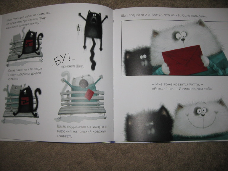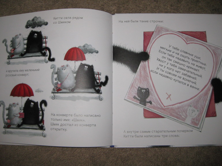Ане книга очень понравилась, и картинки ей интересны и содержание и переживала она за Шмяка, который так старался делал открытку, да еще и кошечку зовут Китти (Китти у нас очень любима). Текста в ней мало, поэтому Аня читала уже раза 3 ее самостоятельно. и просит теперь продолжение историй про этого котенка.