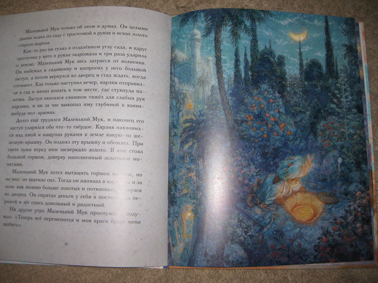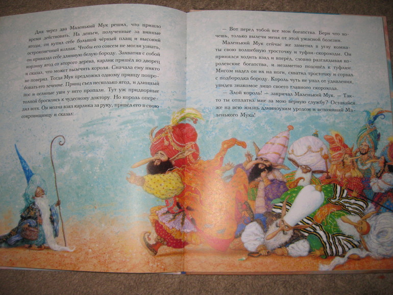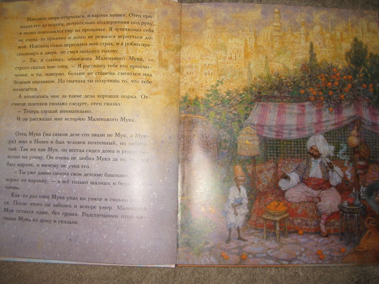 Я бы сказала что книга очень атмосферна, читаешь, разглядываешь картинки и попадаешь в волшебный мир Востока, с его обычаями и волшебством. Аня очень любит разглядывать всякие детали - а где крышка от кувшинчика?? посмотри какие большие на Мука туфли, а вот какой огромный нос вырос у него!!