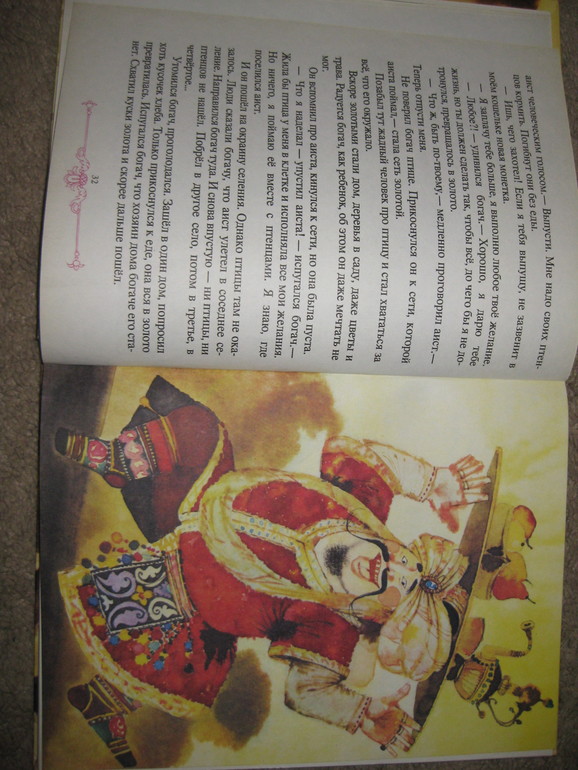 Богач и Аист. Жил был злой но очень богатый человек, однажды поймал он аиста, а птица и говорит "выпусти меня, я исполню любое твое желание" - богач захотел, что бы все к чему бы он ни прикасался становилось золотым, аис исполнил желание и улетел. А богачу этого показалось мало, и он отправился на поиски птицы, далеко зашел, есть захотелось и пить, а к чему он не притронется все в золото превращается, так и умер богач от голода.