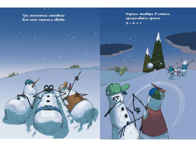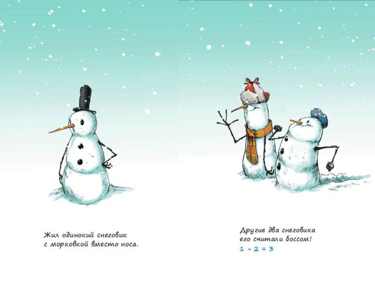 100 веселых снеговиков играют в снежки и прятки, катаются с горки и строят рожицы. Сосчитай их всех!