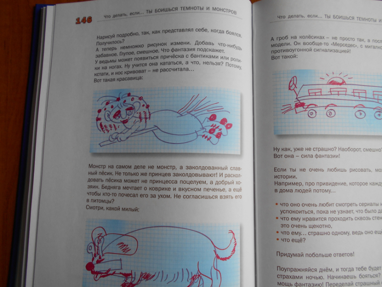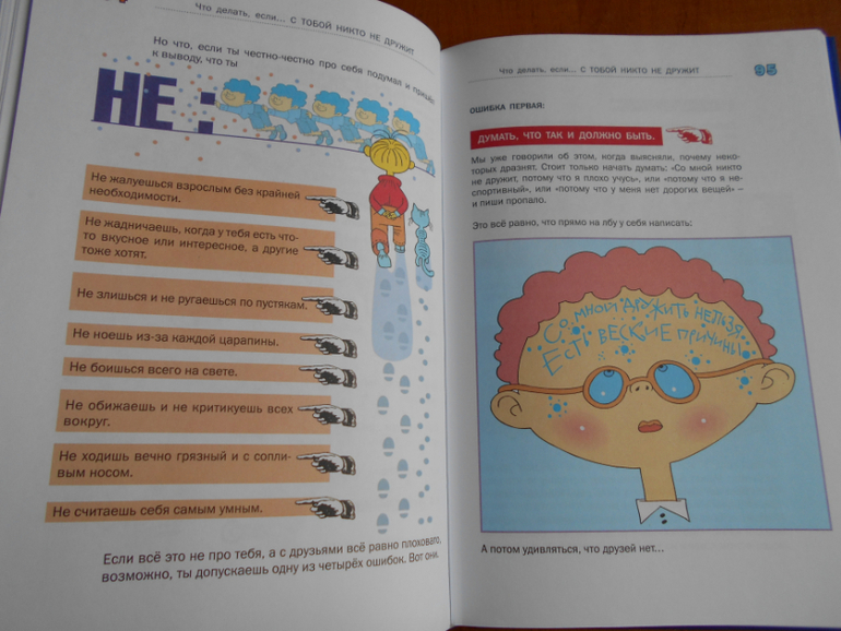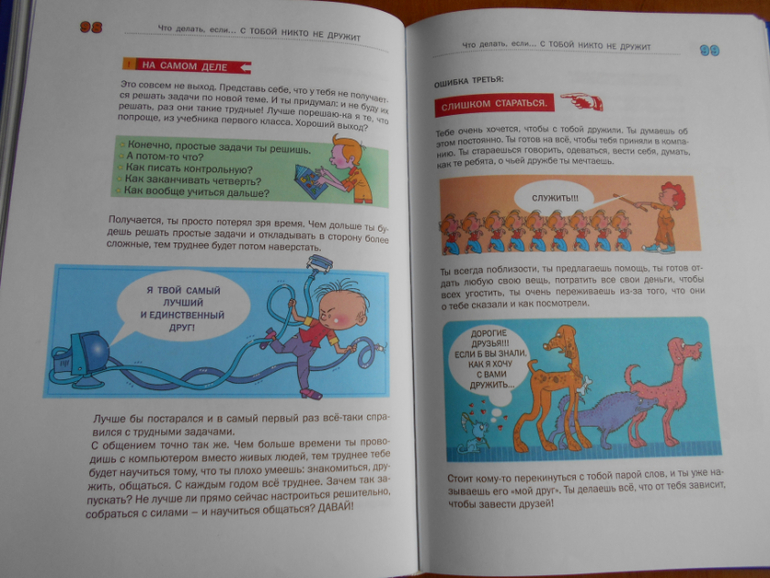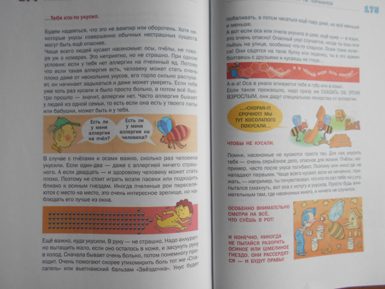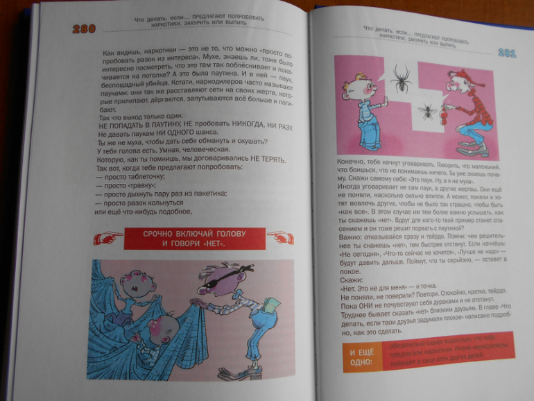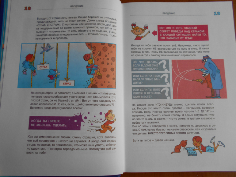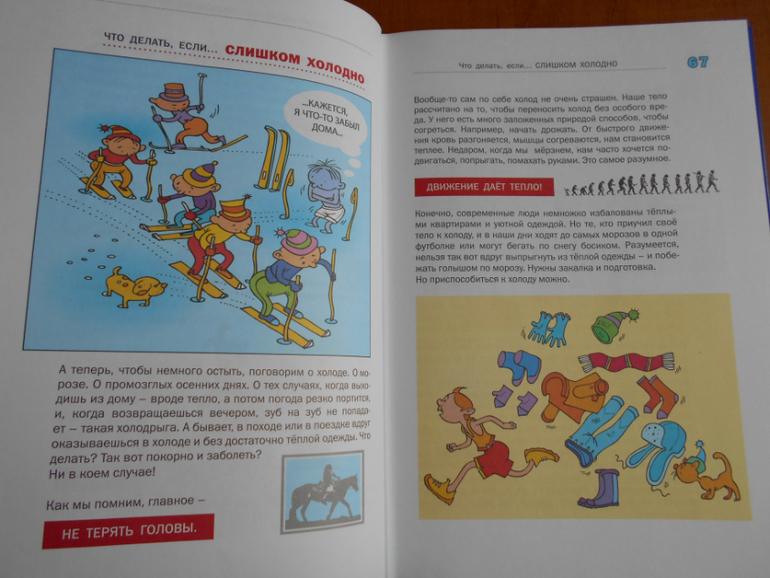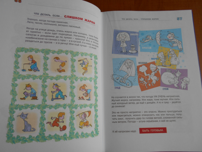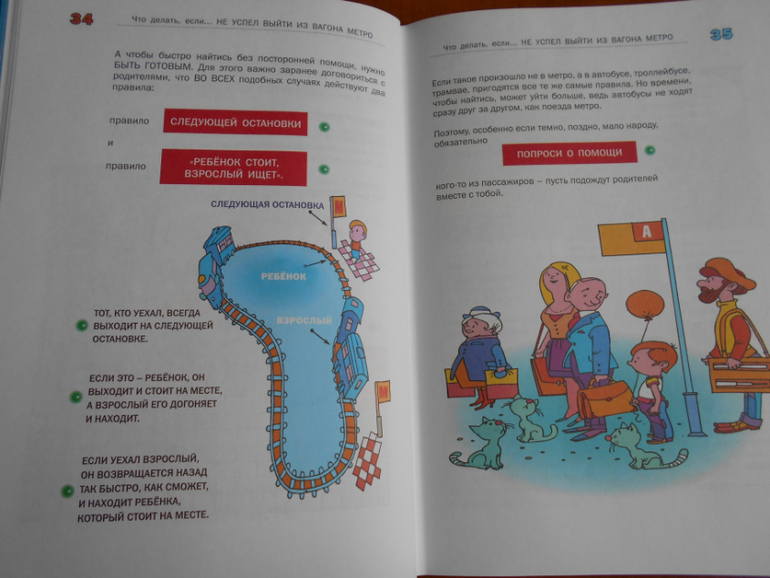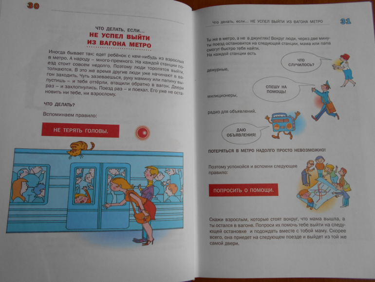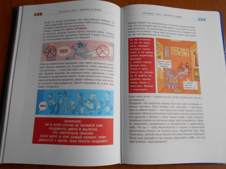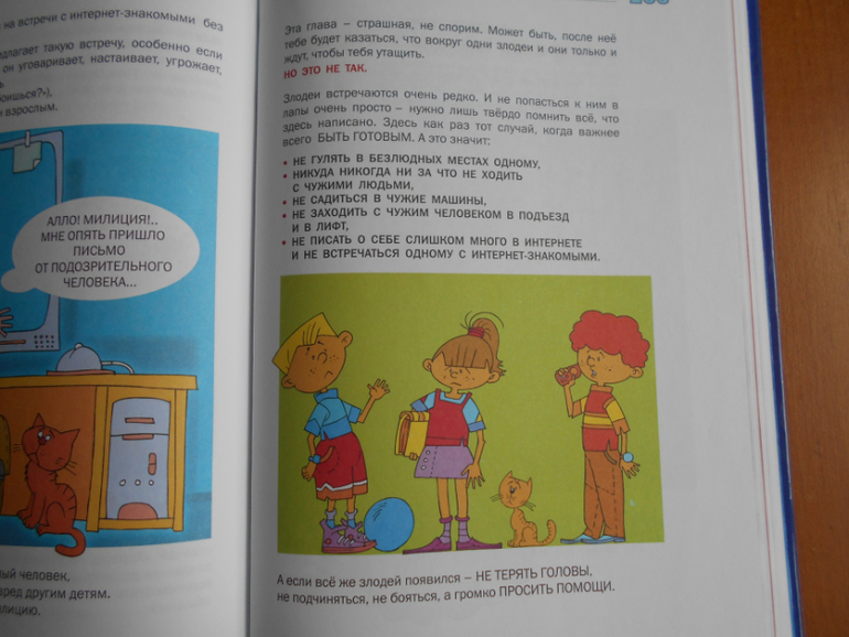 Все это наглядно проиллюстрировано, рисунки интересные, весёлые. Важное выделено рамками, крупным шрифтом или написано красным цветом. В книге есть много реальных примеров из жизни, когда дети не растерялись и действовали правильно.