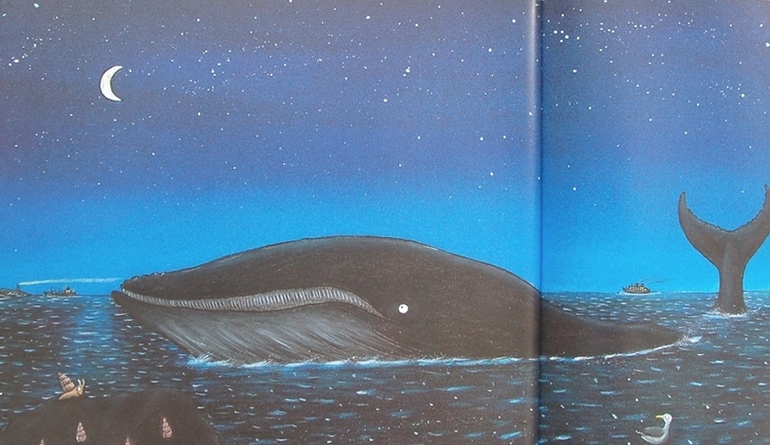 Джулия Дональдсон "Улитка и кит" переплюнула "Хочу к маме!" (у нас всего две книги этого чудесного тройственног союза). Возможно даже не сильно ошибусь, если напишу, что именно в этой книге я увидела, как дети начинают волноваться за сюжет, сочувствовать и сопереживать. Мне она тоже нравится, особенно разворот со звездным небом и вот это: