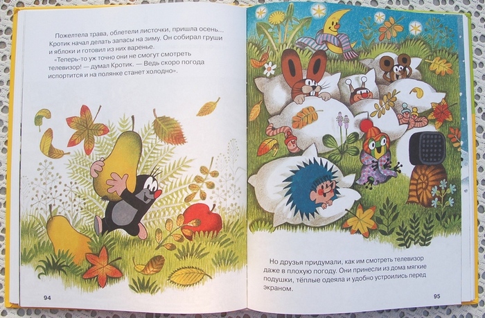 Наипервейшим фаворитом списка будет Кротик. У нас их два: желтый и красный (сама не знаю, почему красный). Дети готовы слушать всю книгу подряд и потом еще вторую. Иногда смотрим и мультики про Кротика. Как был любимцем с зимы, так и остался.